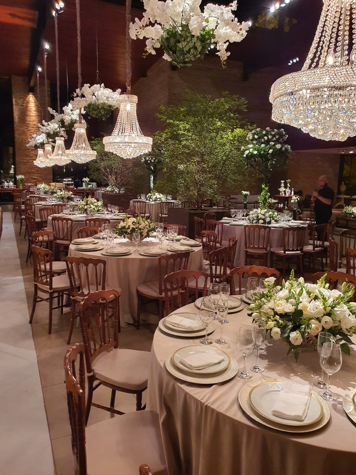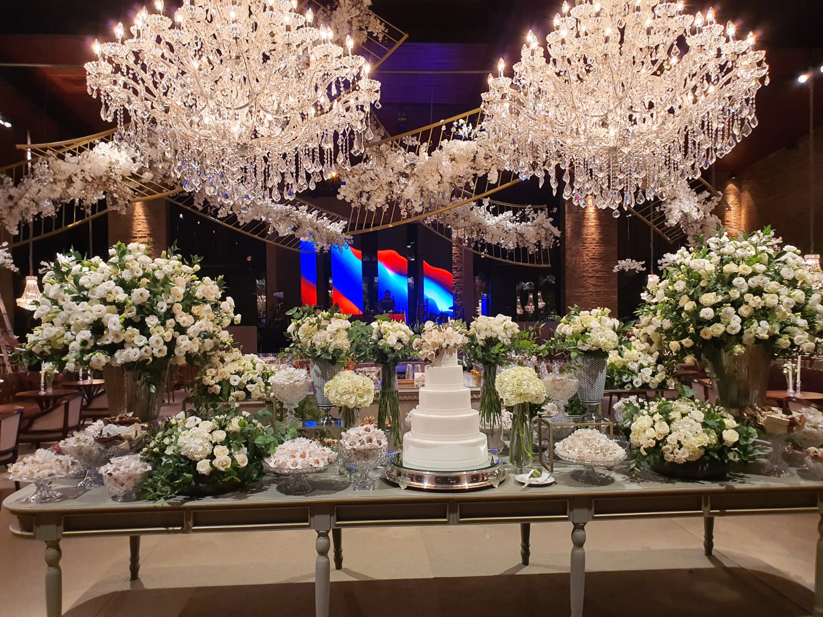 Quando o cortejo seguiu para o salão de festas o espetáculo manteve o motivo da cor branca: do teto caiam arranjos compostos de orquídeas, bicos de leões . Nas mesas predominavam as Orquídeas, Lisianthus e Bocas de leão tudo branco e sobre cada mesa um enorme lustre de cristal. Pense num encantamento.