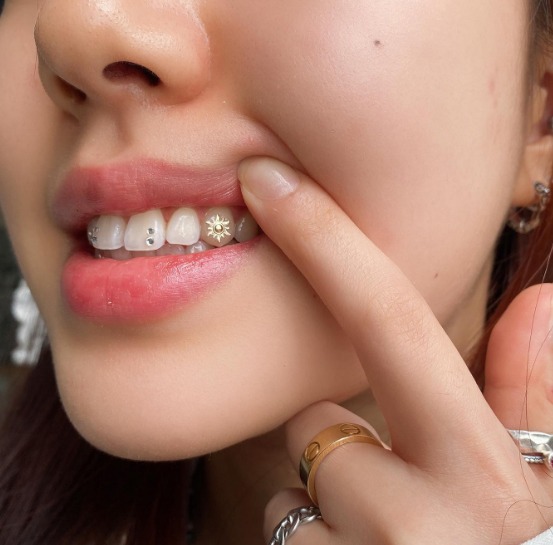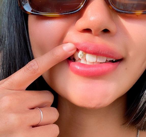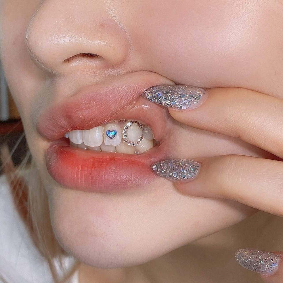 Os piercings nos dentes também são chamados de Tooth Gem, é uma influência da estética Y2K que a geração Z (que adora tendências passadas) resgatou dos anos 2000.