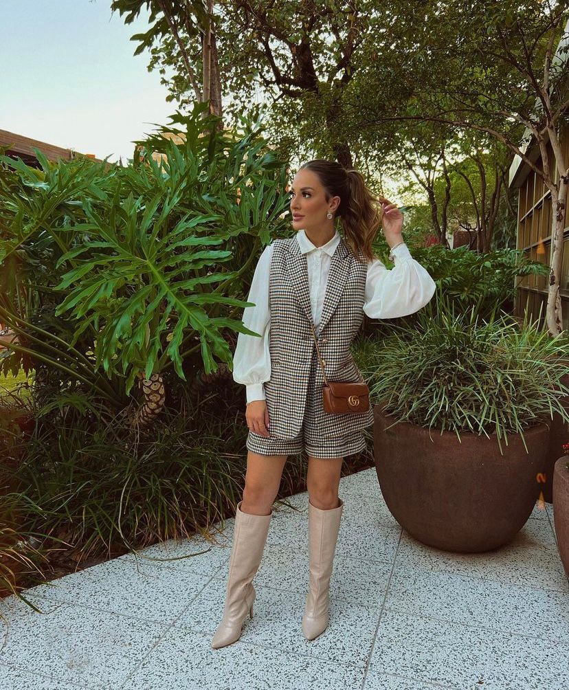 - Look de alfaiataria cor lisa ou xadrez com bota clara tratorada.