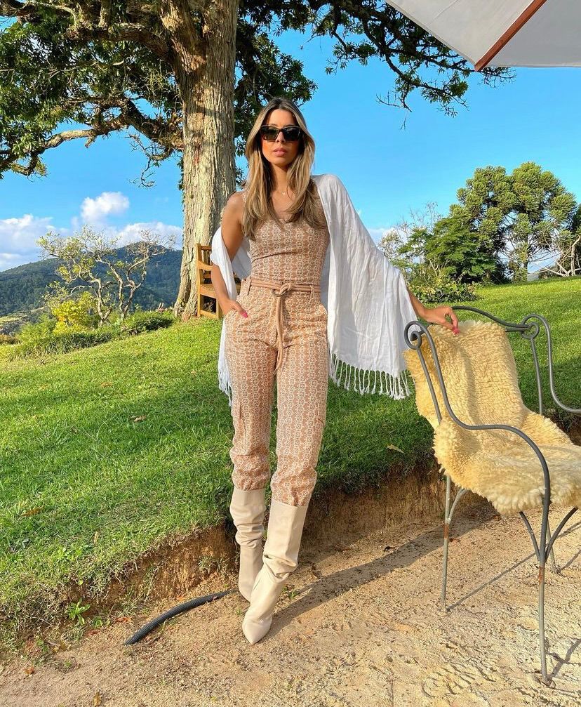 - Vestido ou conjunto com tons terrosos e bota preta ou bota marrom.