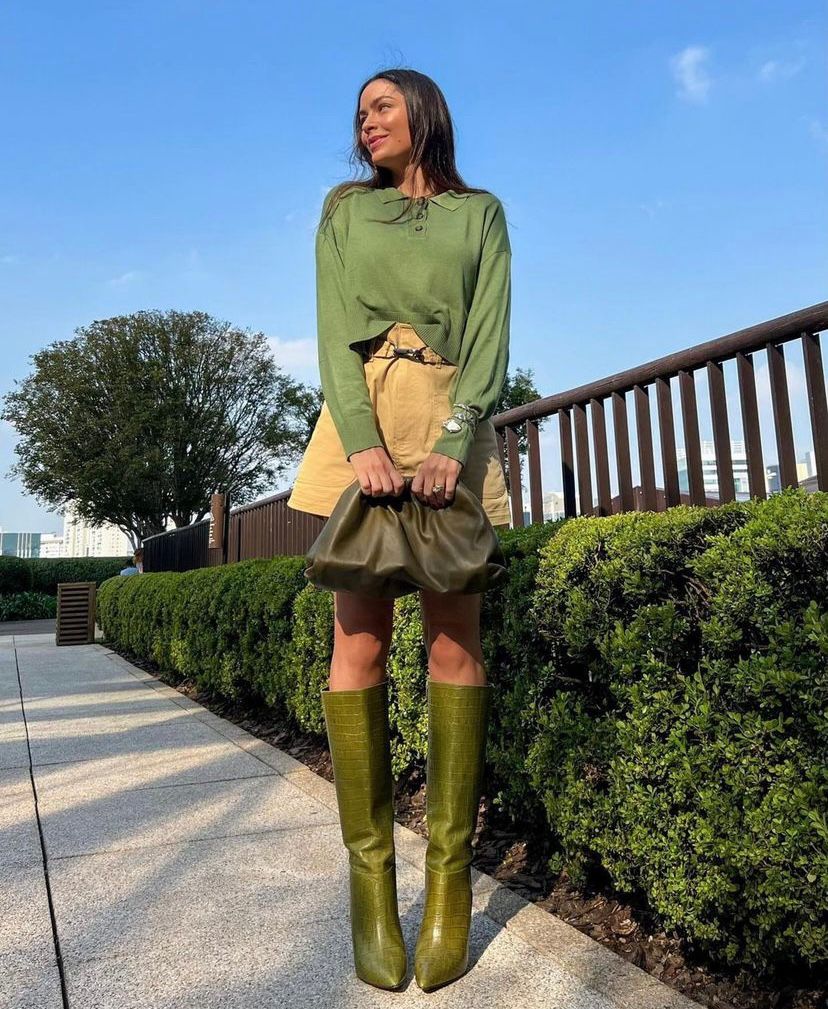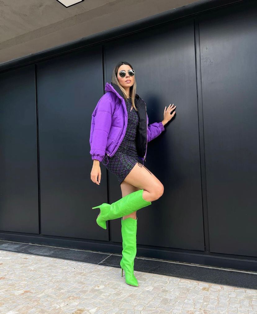 - As botas de cano alto coloridas (que são o destaque desse ano), podem ser usadas com cores que combinam, como um vestido azul claro e uma bota pink, ou ao contrário, um vestido pink com a bota azul. Também podemos usar looks tom sobre tom, como um conjunto verde claro com a bota verde musgo, ou combinar cores neutras com a bota verde. Também fica legal o look color block com a bota da mesma cor, claro que é algo mais chamativo, mas fica super estiloso. Look roxo com a bota verde. Look com cor clara mais as botas coloridas.