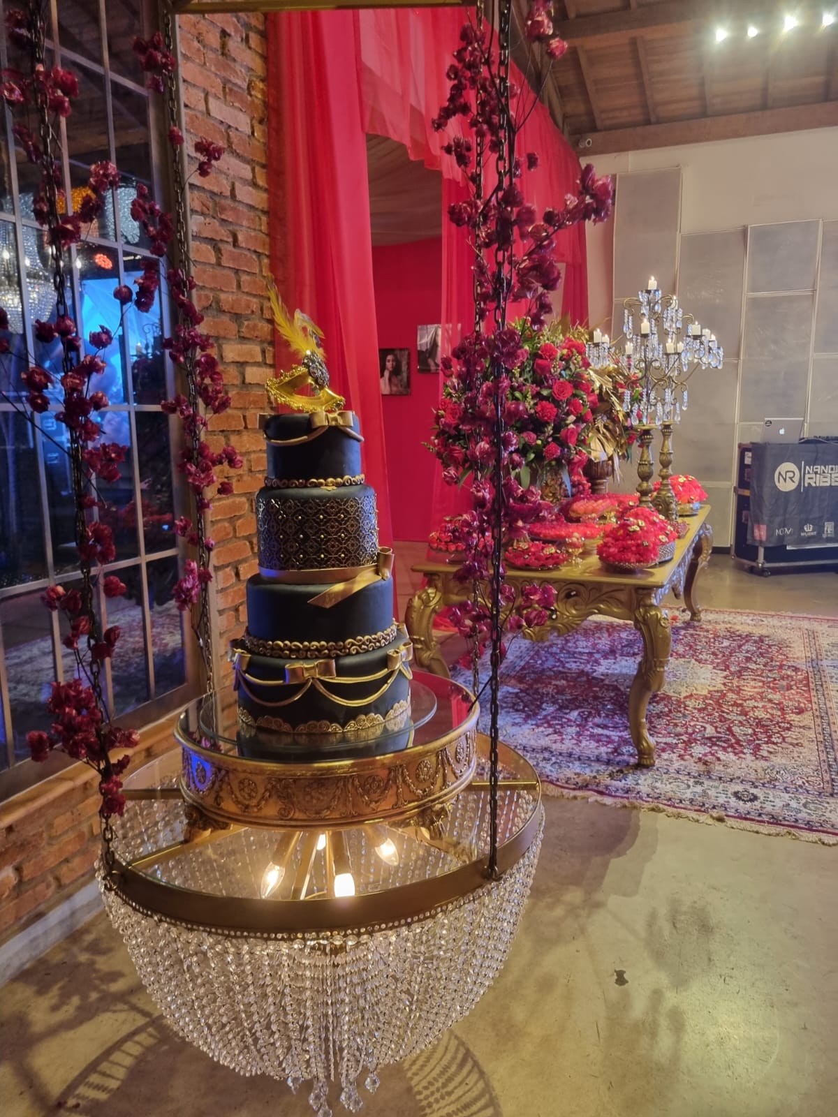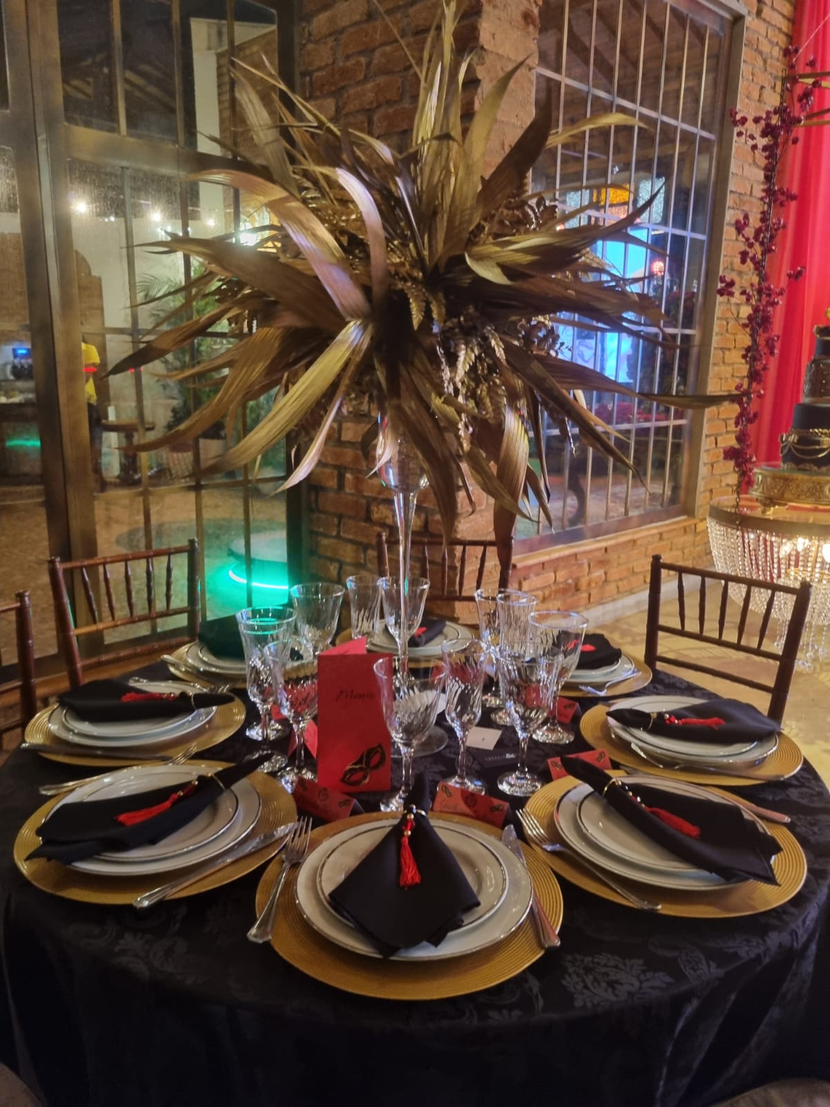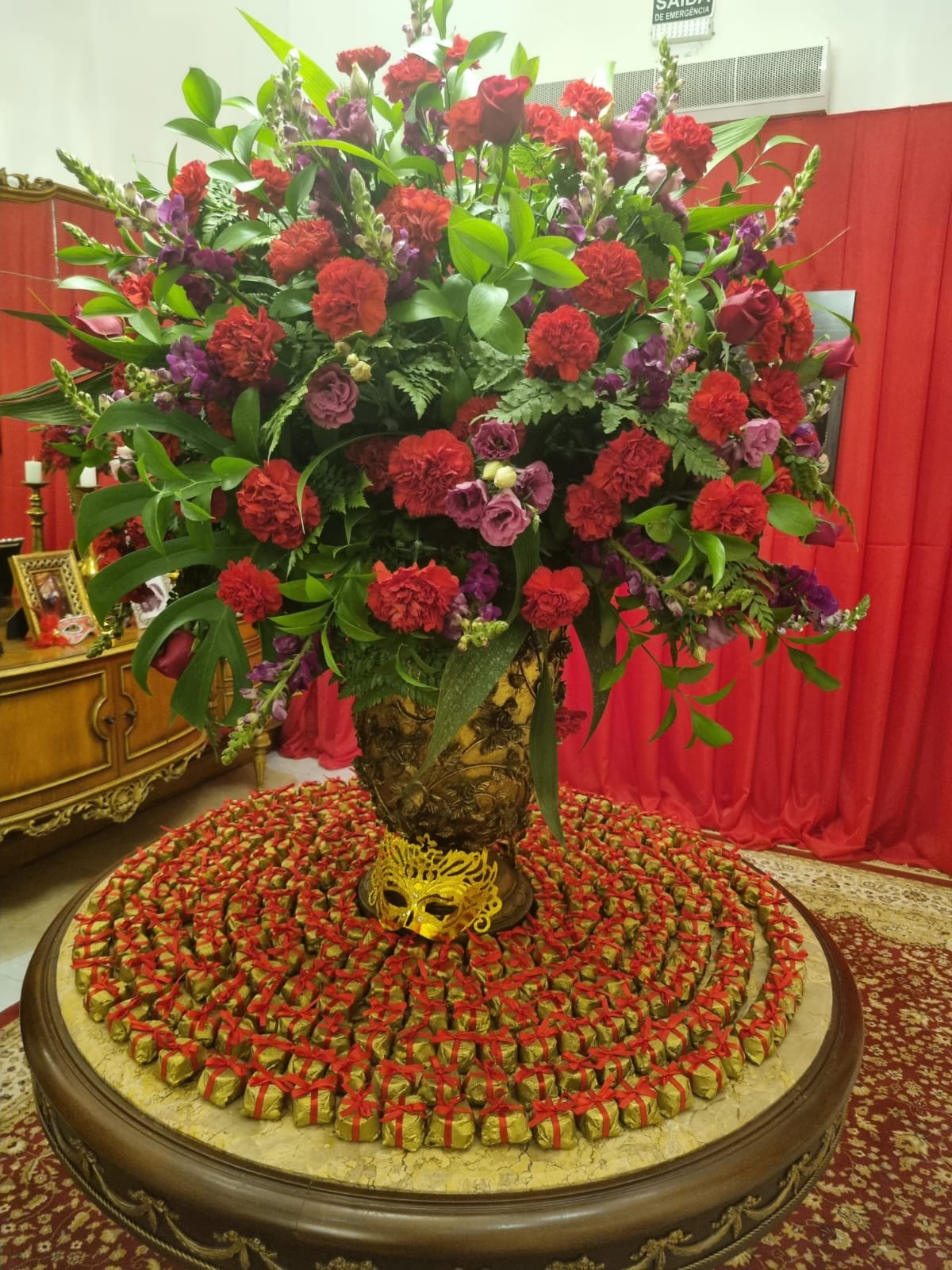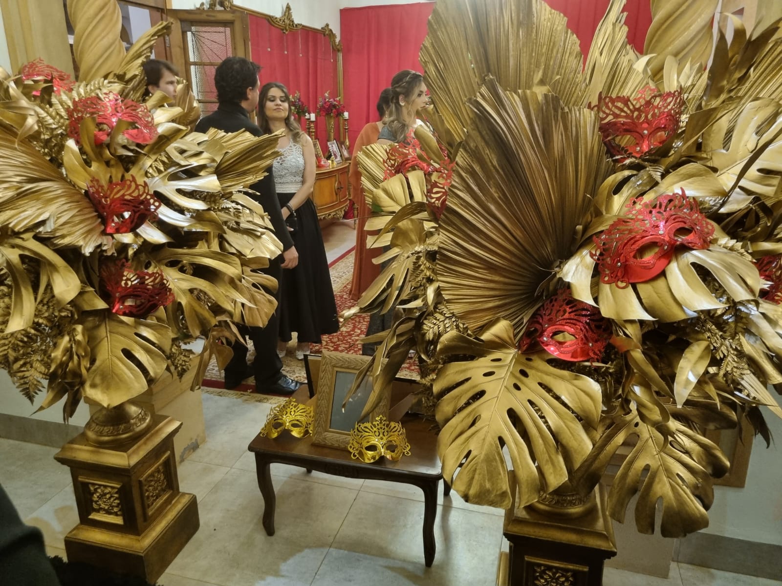 Logo na entrada a florista Maysa Tanaka usou o dourado para as folhagens entre plumas vermelhas e máscaras de tons monocromáticos , ideia brilhante emprestada dos castelos e suas suntuosidades. A poucos passos dali a Aniversariante recebia os convidados num ambiente revestido de chamalote vermelho e plumas, muitas plumas.