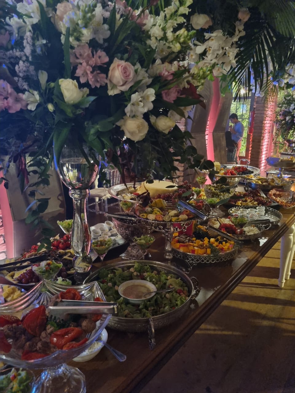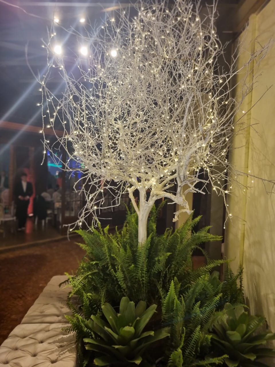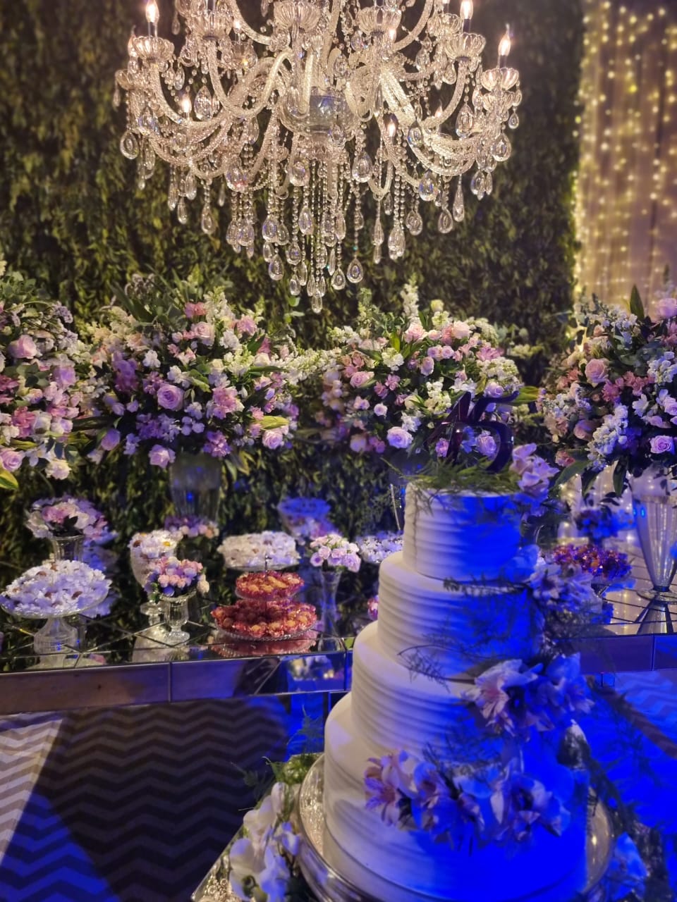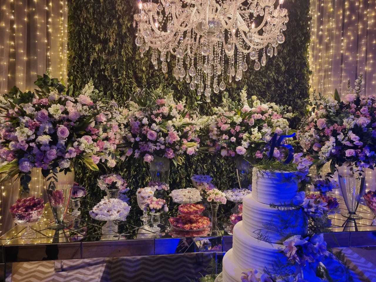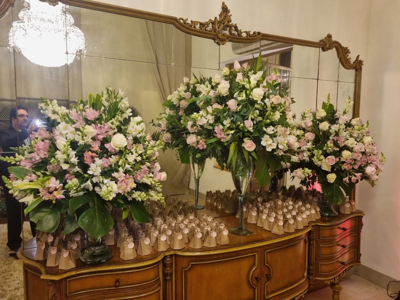 Arranjos imensos decoravam o ambiente, na cor branca; eram rosas, Lisianthus, lírios, orquídeas, iluminados por enormes lustres de cristal.