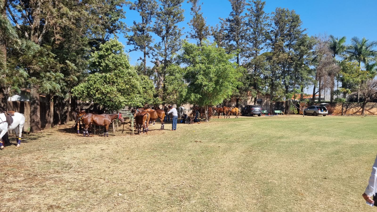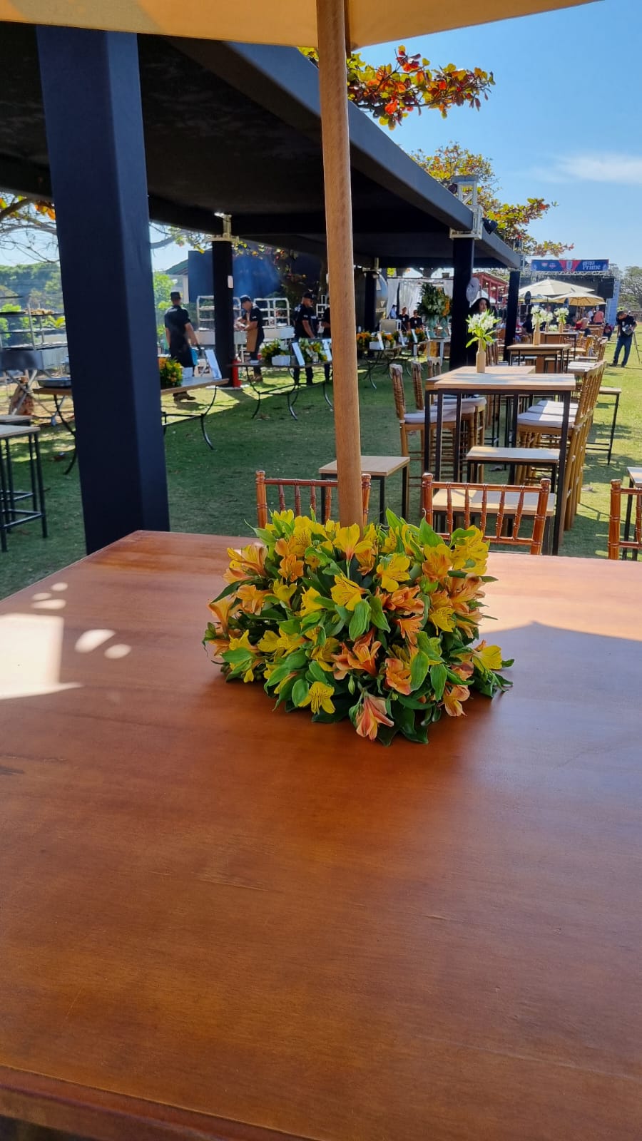 Sob os frondosos flamboyants plantados ao lado do campo de polo, foram instaladas as churrasqueiras; os aparadores estavam decorados com lisianthus e lírios amarelos e laranjas. Formou-se ali um jardim aconchegado por mesas, poltronas, bancos, onde reinou um clima de elegância natural.