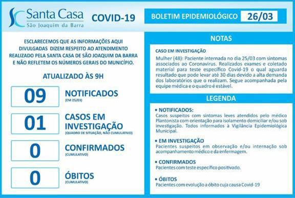 A Santa Casa de Misericórdia de São Joaquim da Barra divulgou o boletim atualizado (dia 26) da Covid-19, doença causada pela Coronavírus.