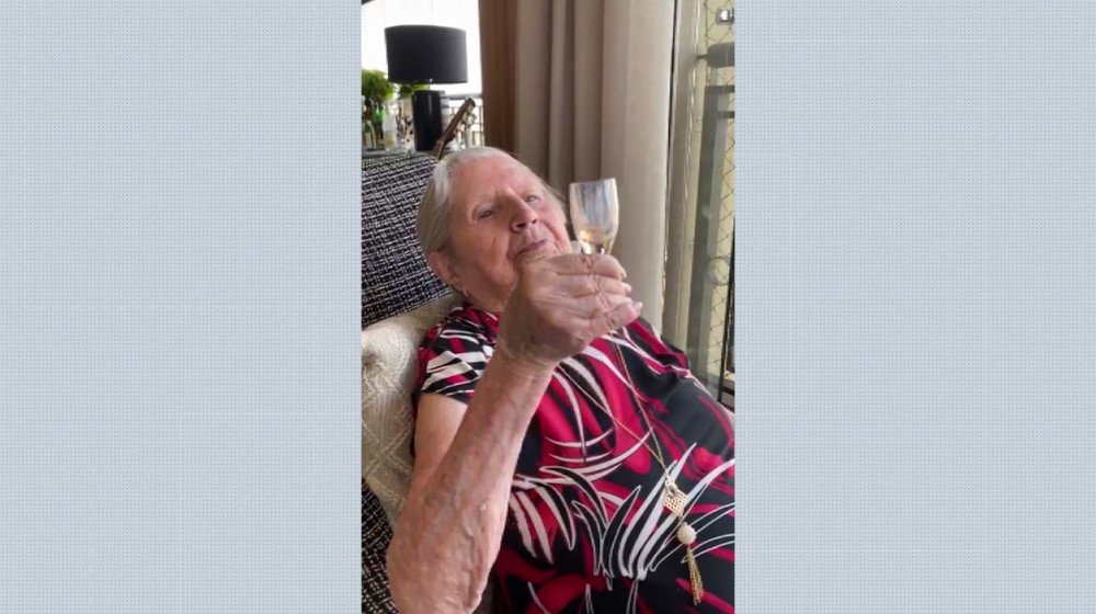 Na terça-feira (14), dona Philomena caprichou no visual e, mais do que animada, comemorou o aniversário de 103 anos. Teve parabéns, balão, bolo e brinde. Tudo pela internet.