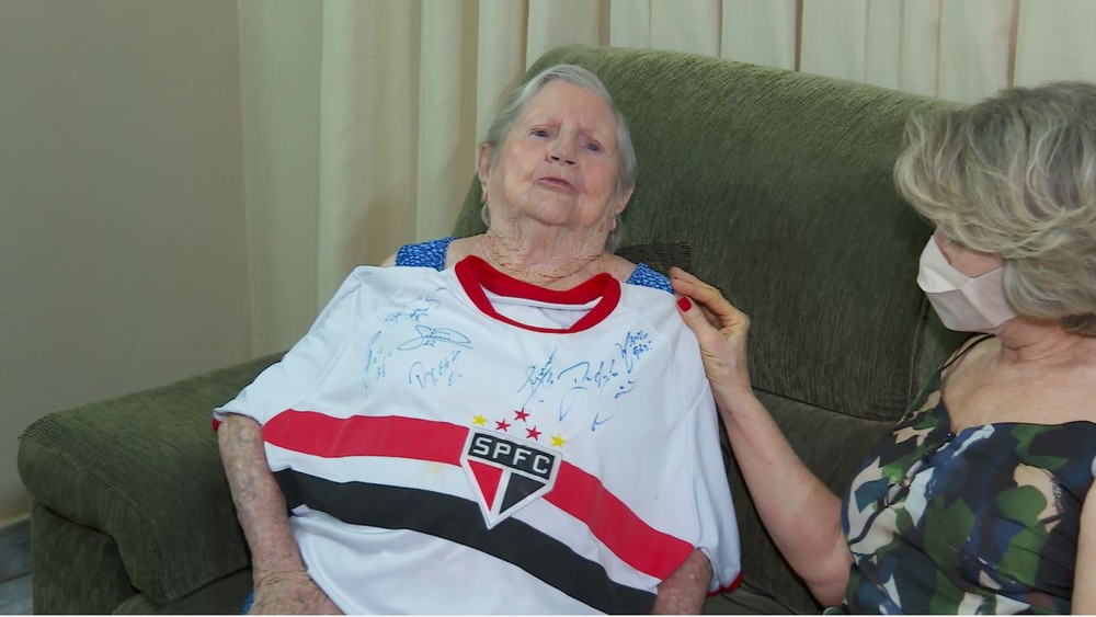 Acostumada a bater papo com amigos e familiares na porta de casa, dona Philomena precisou mudar a rotina desde março, ficando mais reclusa. Mas, na sala de TV, ela continua a fazer uma das coisas que mais gosta: torcer pelo São Paulo, o time do coração. “Eu gosto de todos os times, mas igual o São Paulo não existe. Para mim é São Paulo e São Paulo, desde pequena.”