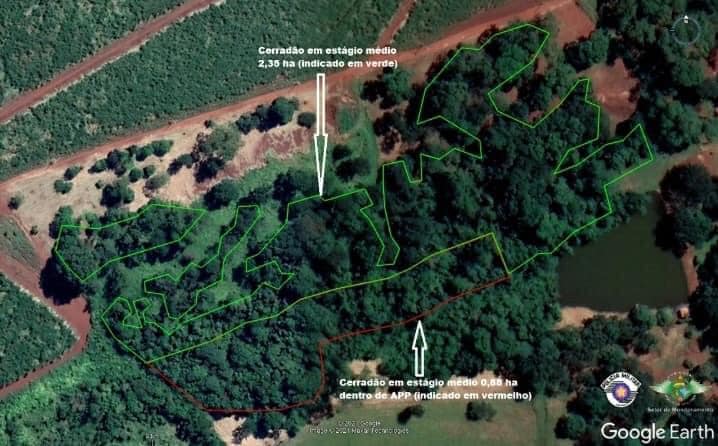 O bosqueamento atingiu 0,88 ha na APP (Área de Preservação Permanente) de um afluente do Córrego da Barra e 2,35 ha sob o Cerradão (protegido pela Lei 13.550/09), que se encontra ao lado dela.