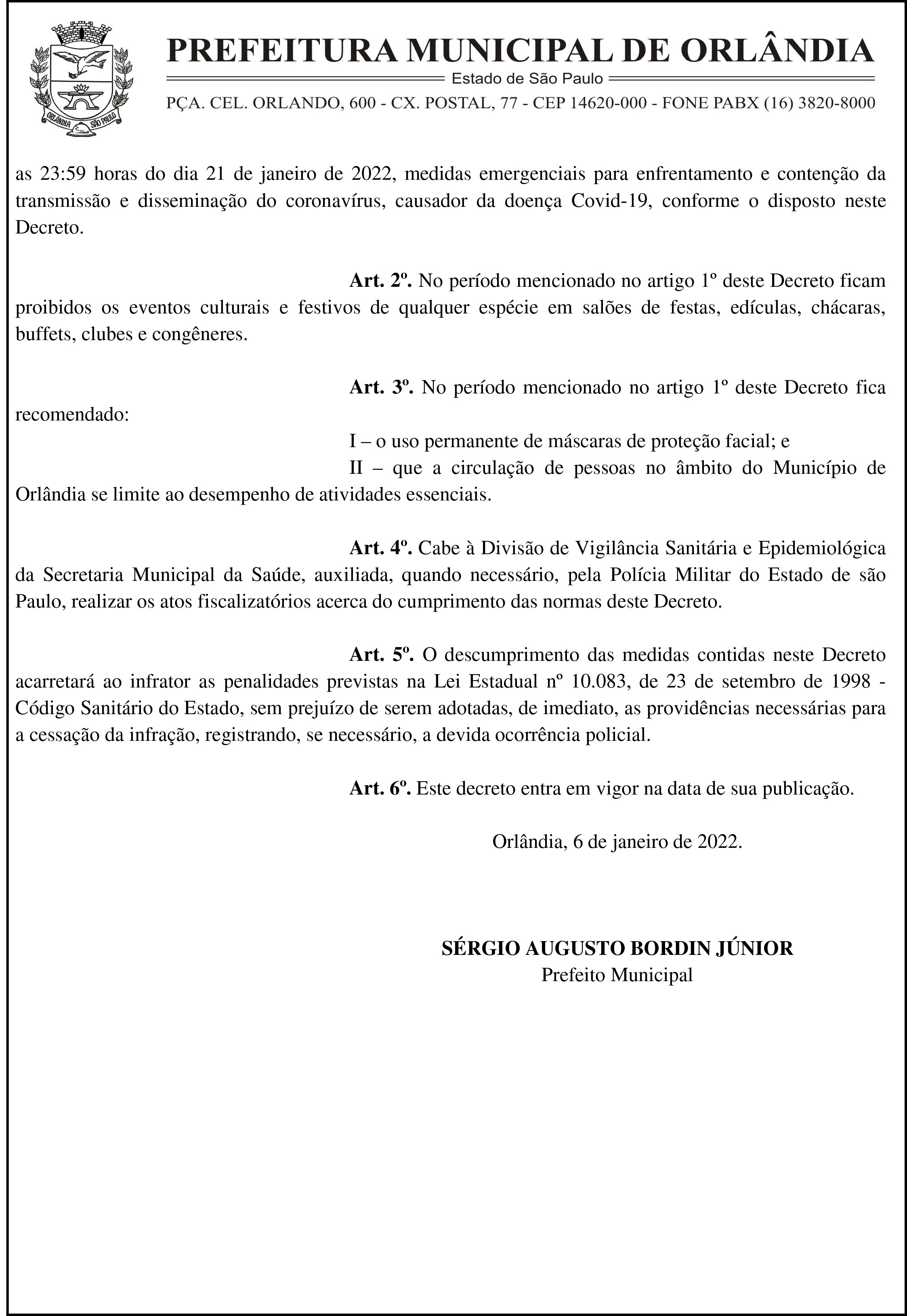 O prefeito de Orlândia Sérgio Augusto Bordin, emitiu novo decreto valendo a partir de hoje (6) proibindo eventos culturais e festivos de qualquer espécie em salões de festas, edículas, chácaras, buffets, clubes e congêneres.