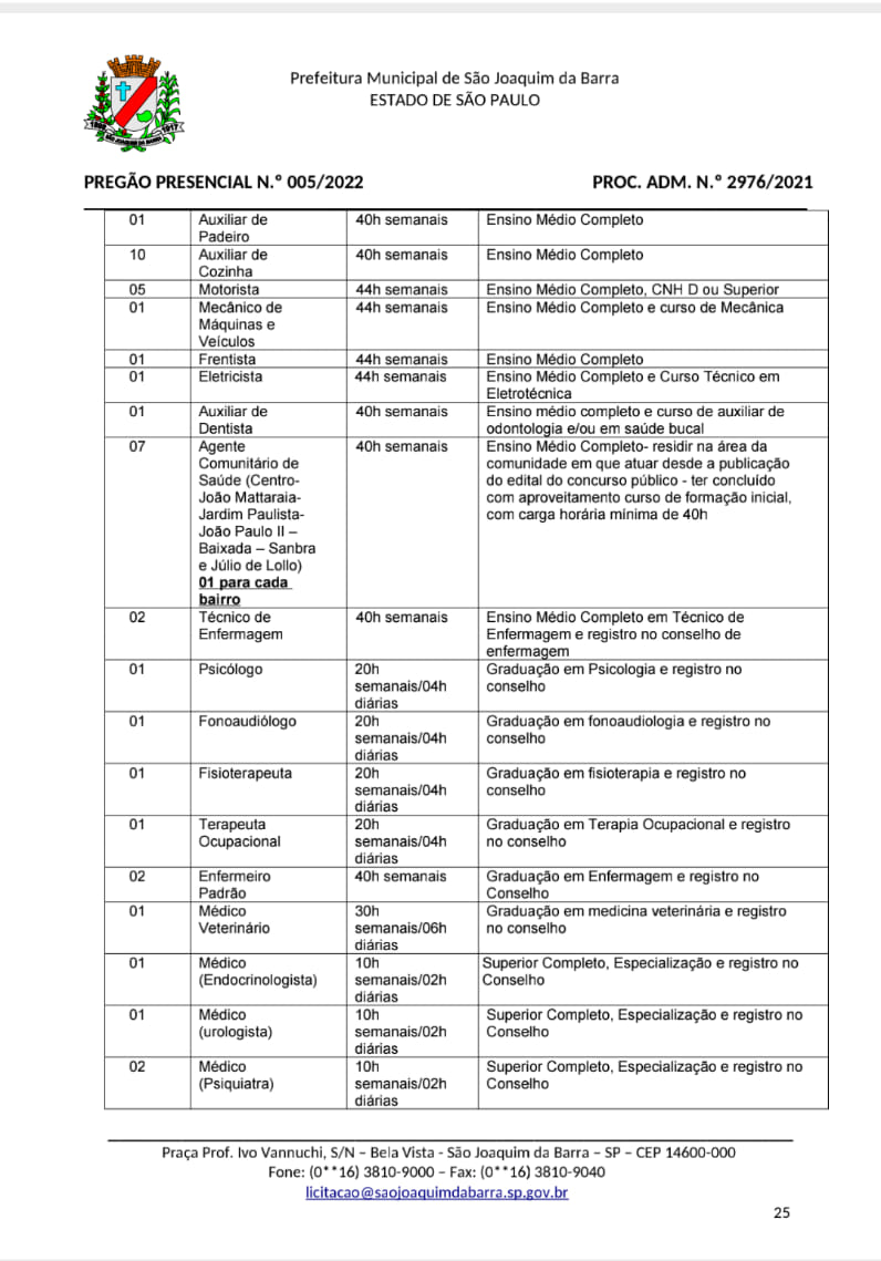 De acordo com o edital publicado no site da prefeitura, serão 126 cargos, de faxineira a médico. Veja abaixo os cargos.