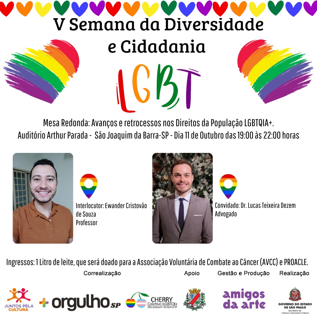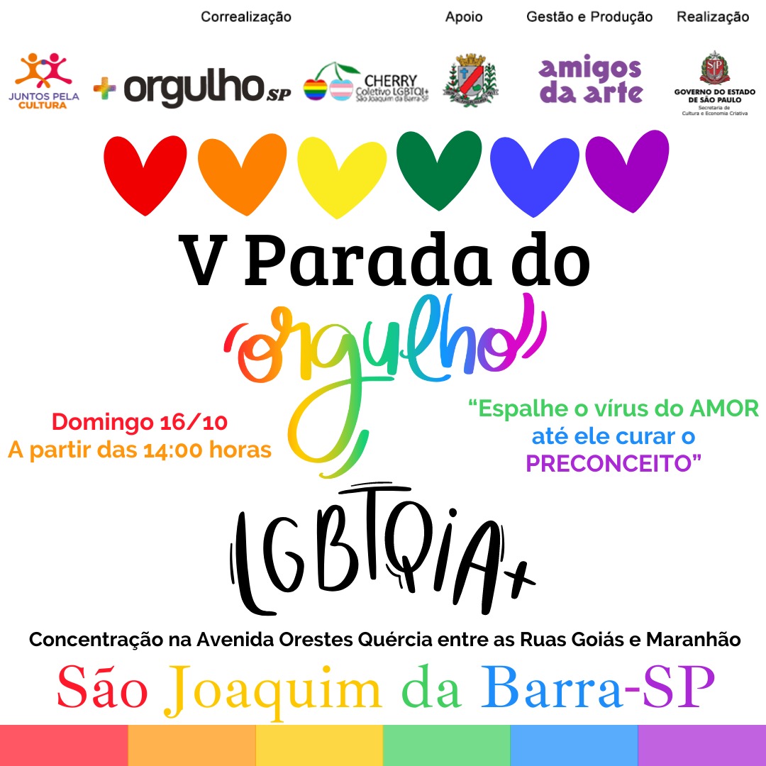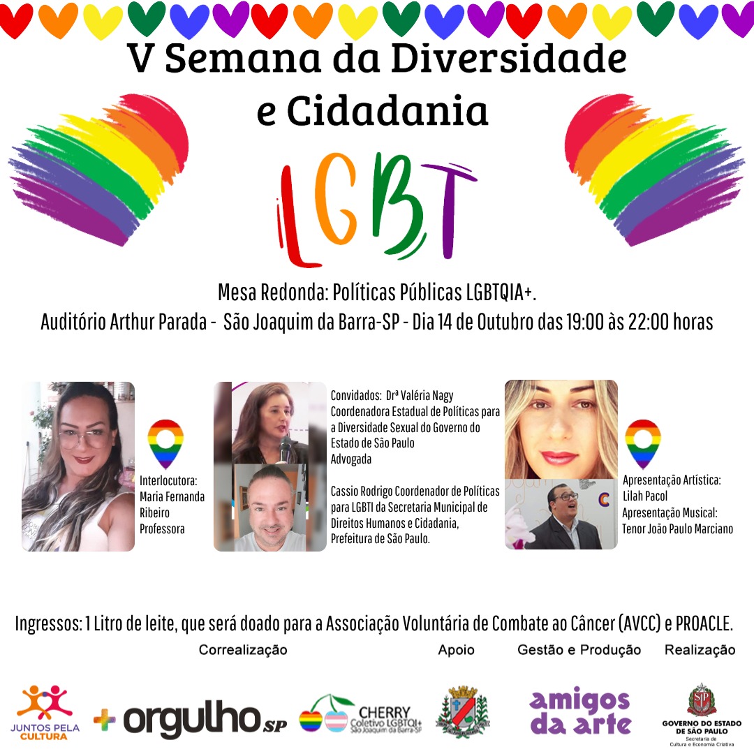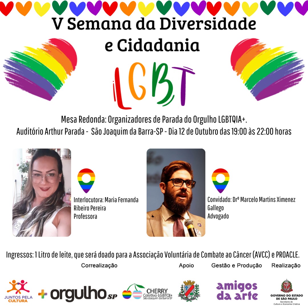 A Semana da Diversidade LGBT 2022 de São Joaquim da Barra começa nesta segunda-feira (10) e vai até o dia 16 de outubro (domingo). O evento é realizado pelo Coletivo LGBT Cherry, viabilizado pela Secretaria da Cultura e Economia Criativa do Estado de São Paulo, com apoio do Amigos da Arte.