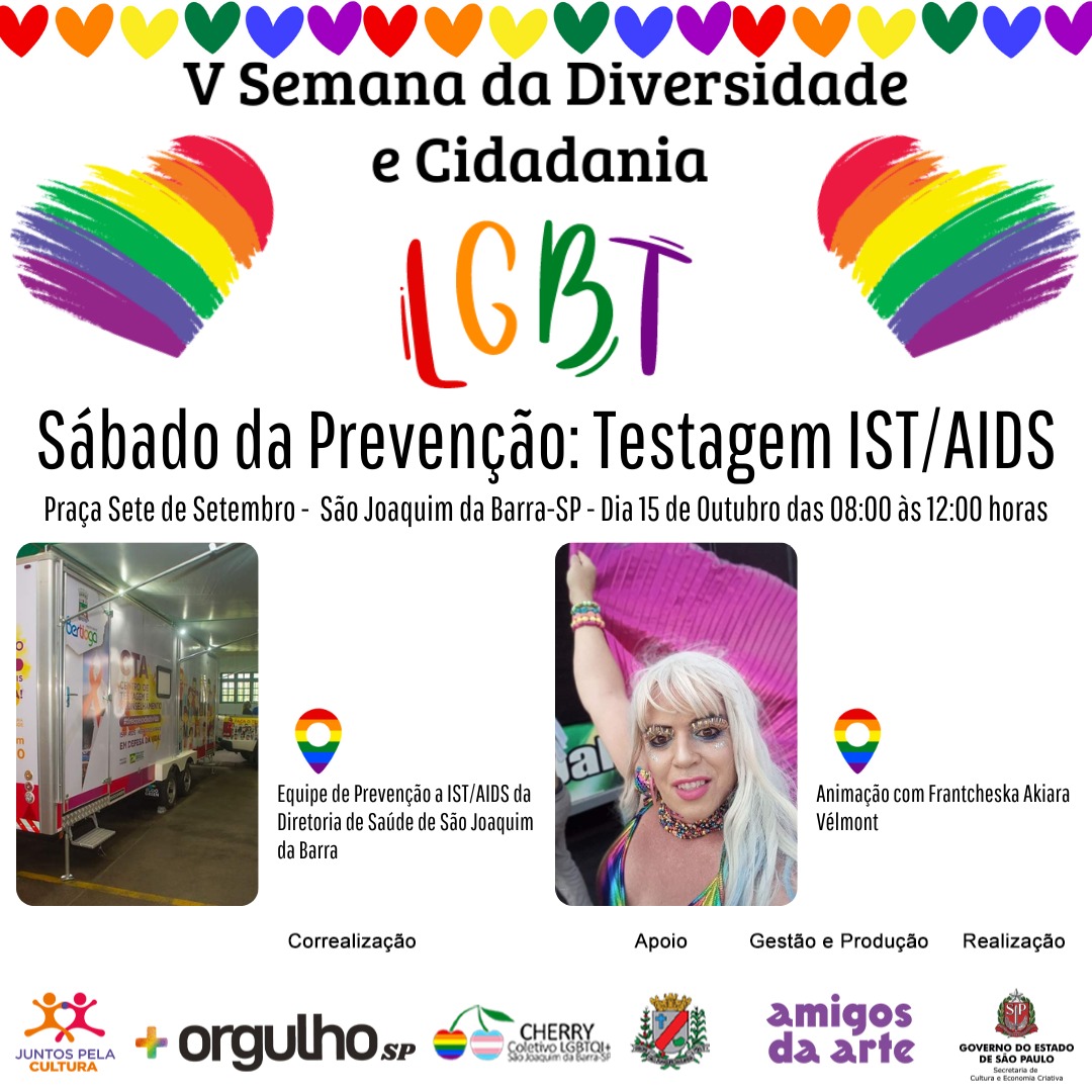 No sábado (15) acontecerá a testagem IST/AIDS gratuita na Praça Sete de Setembro, das 8h às 12h. A ação será realizada pela equipe de Prevenção a IST/AIDS da diretoria de Saúde de São Joaquim da Barra e contará com animação da artista Frantcheska Akiara Velmont.