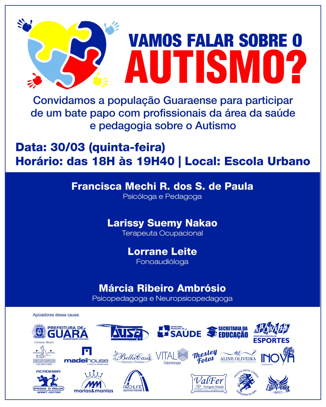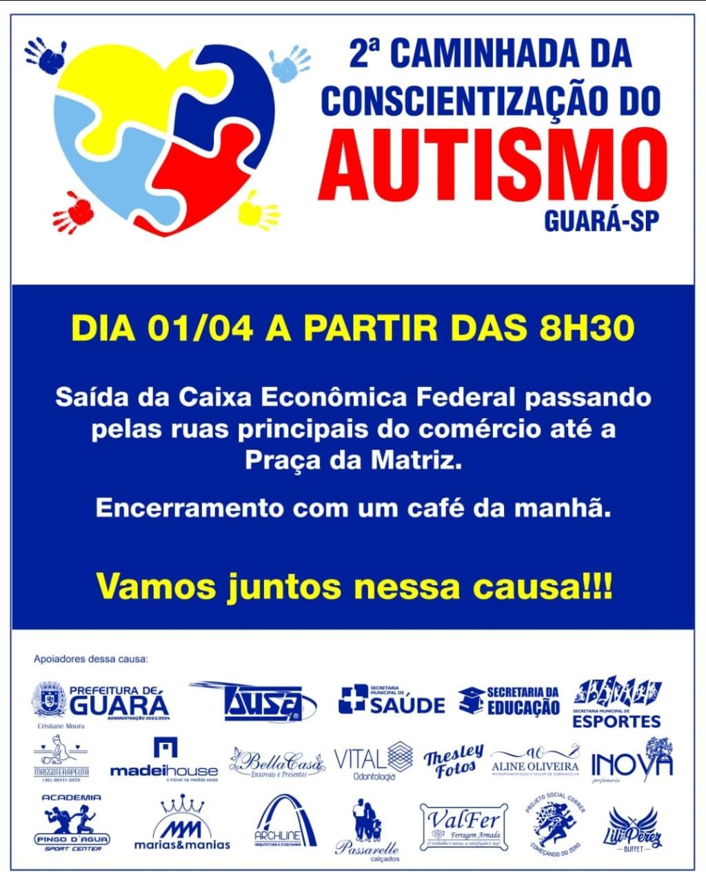 Aproveitando a data, um grupo de moradores de Guará iniciou um movimento para conscientização sobre o TEA - Transtorno do Espectro Autismo, com caminhada e um bate-papo com fonoaudióloga, psicopedagoga, psicóloga e terapeuta ocupacional para trazer mais informação aos profissionais da área de ensino, estendendo também para a população.