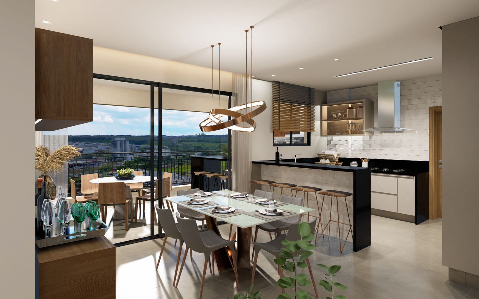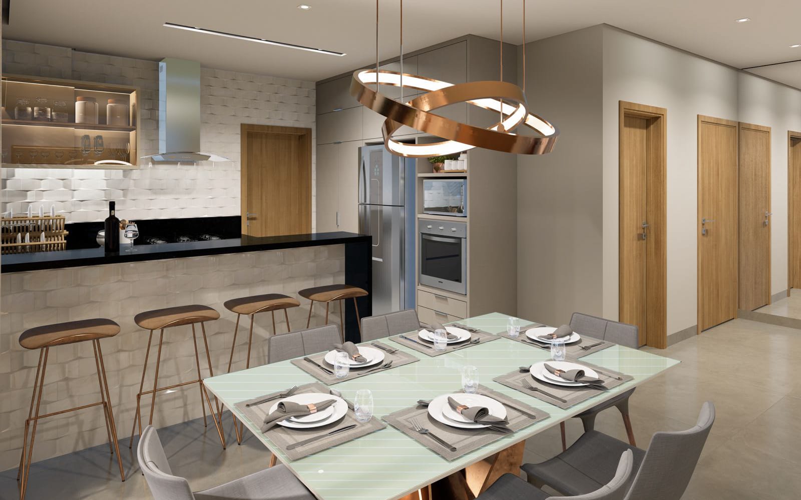 - Cozinha integrada à sala de jantar, favorecendo o convívio, ou cozinha separada, ideal para quem preza por ambientes funcionais e bem divididos;
