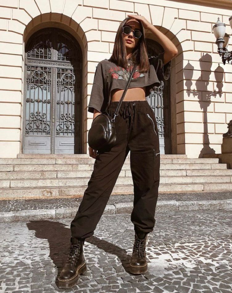 - T-shirt com calça cargo e coturno.