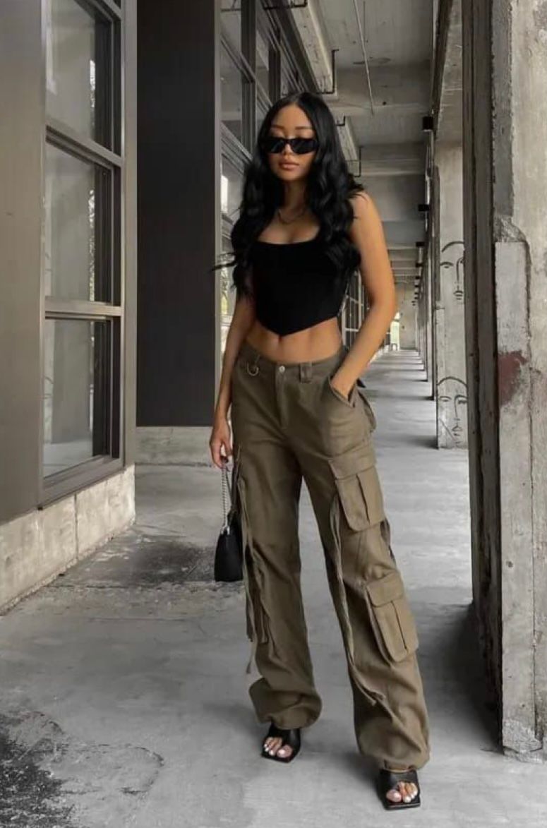 - Calça cargo estilo militar com blusa preta social e scarpin.