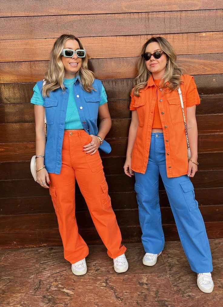 - Calça com colete colorido.