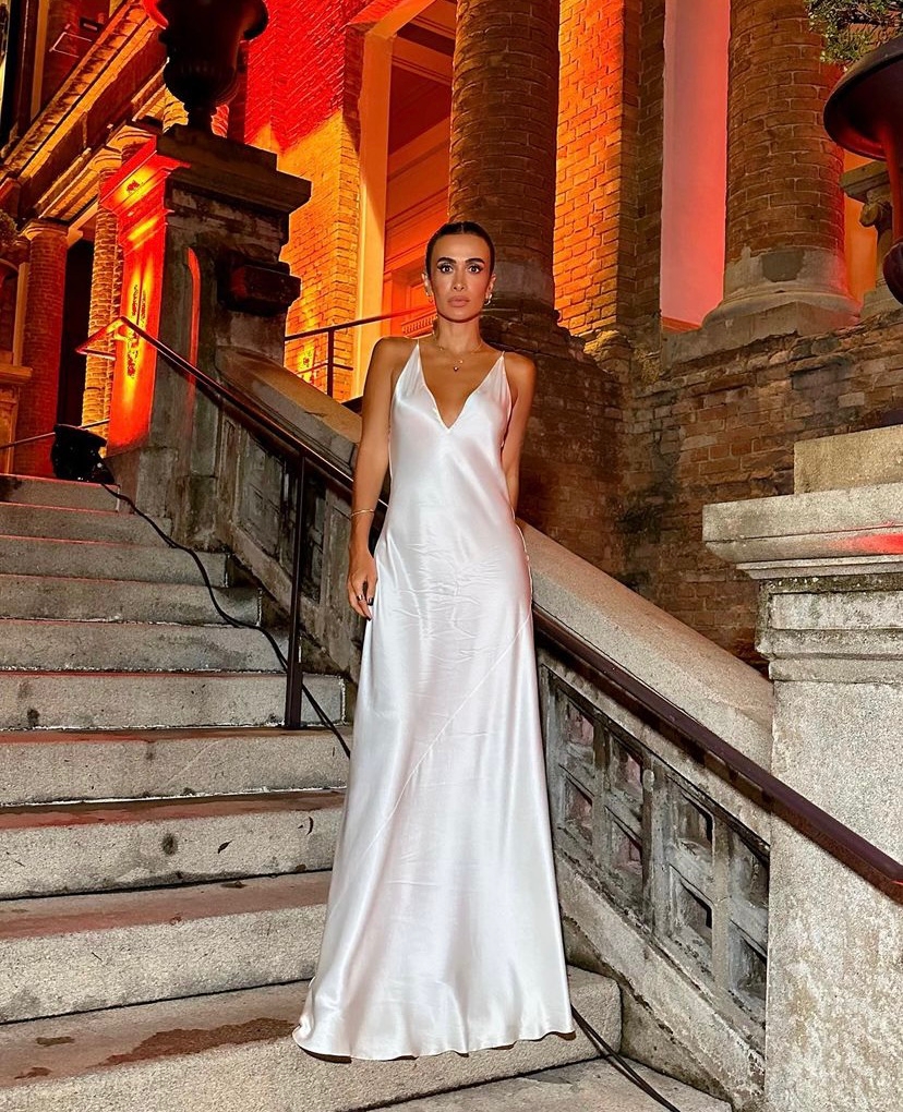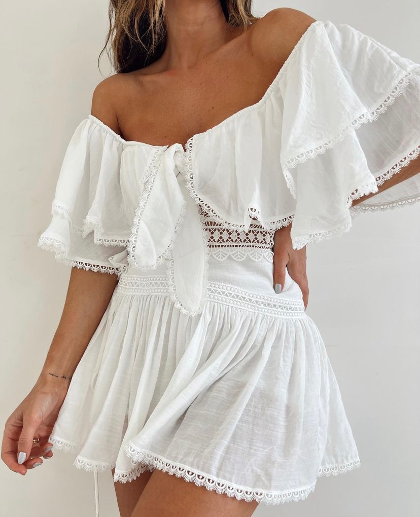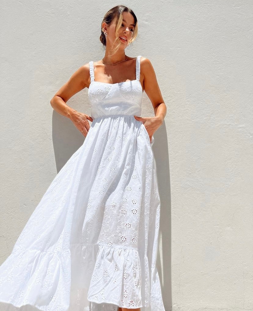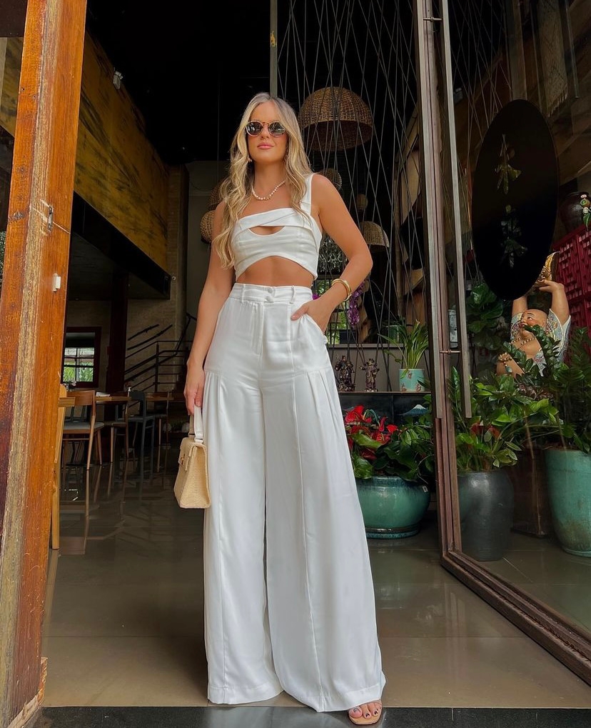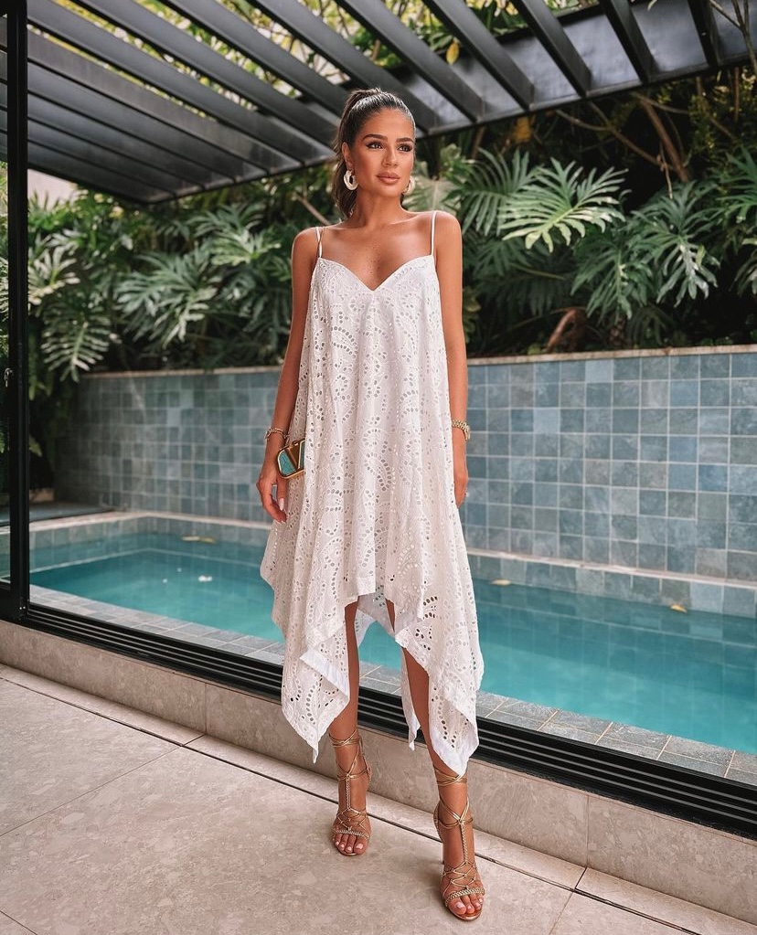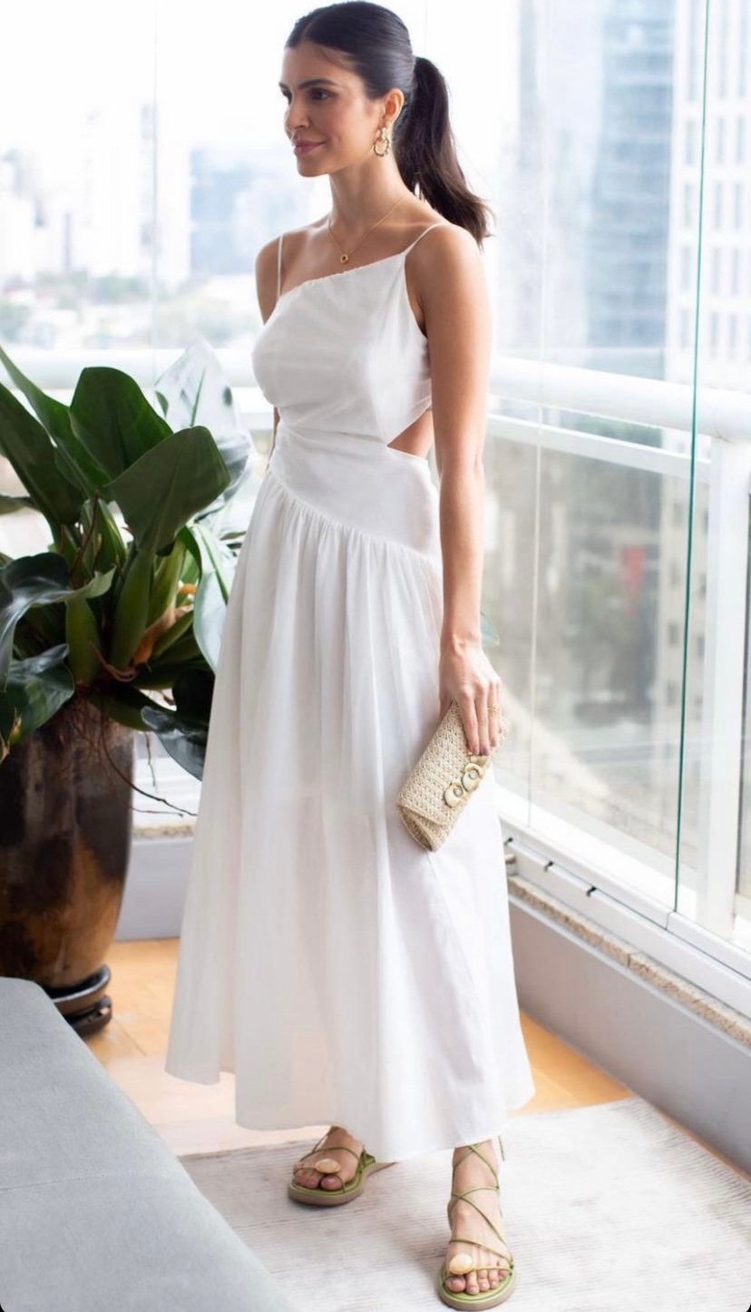 - Vestidos ou conjuntos estilo praianos branco, com tecido de algodão.