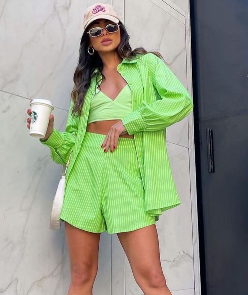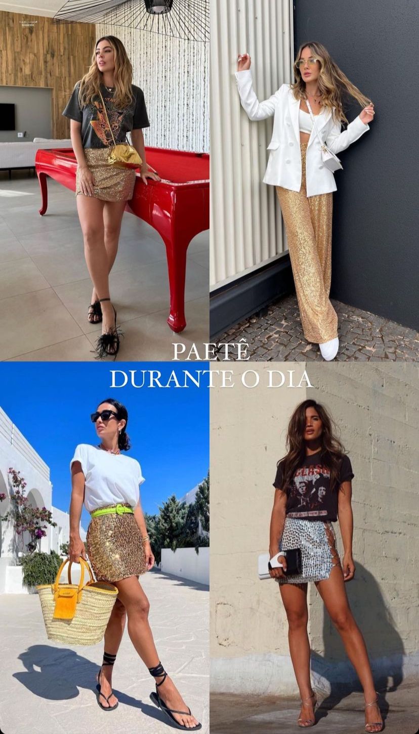 Paetê durante o dia!! O paetê é uma trend que não vai sair de moda tão cedo, e agora virou tendência usar também durante o dia, com T-shirt + saia ou short de paetês ou camisa com calça de paetê.