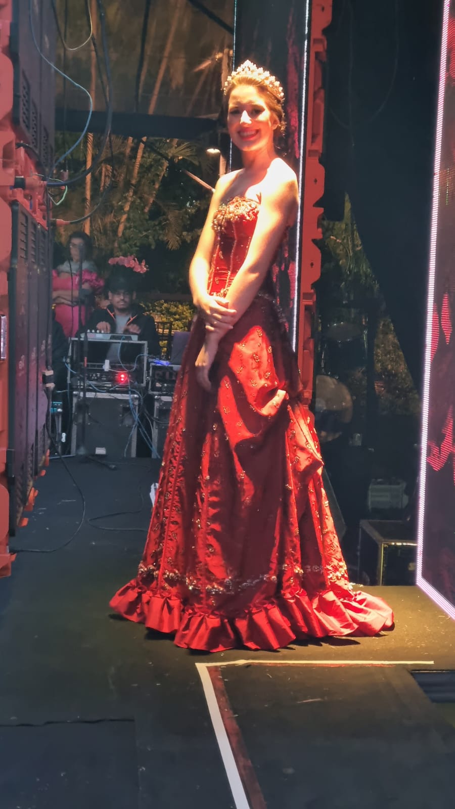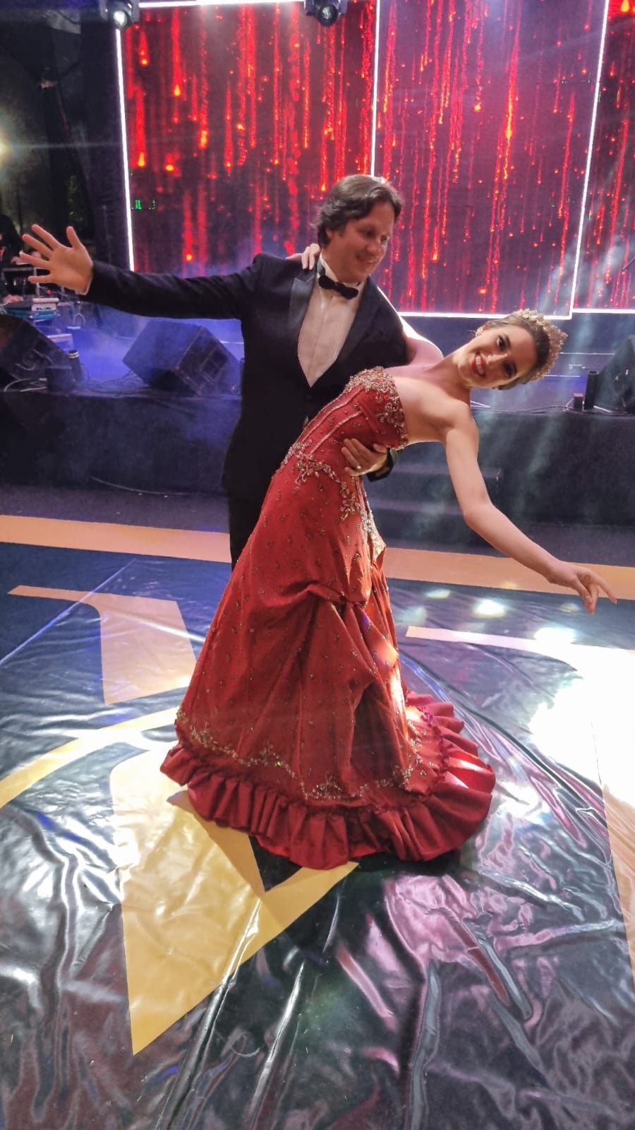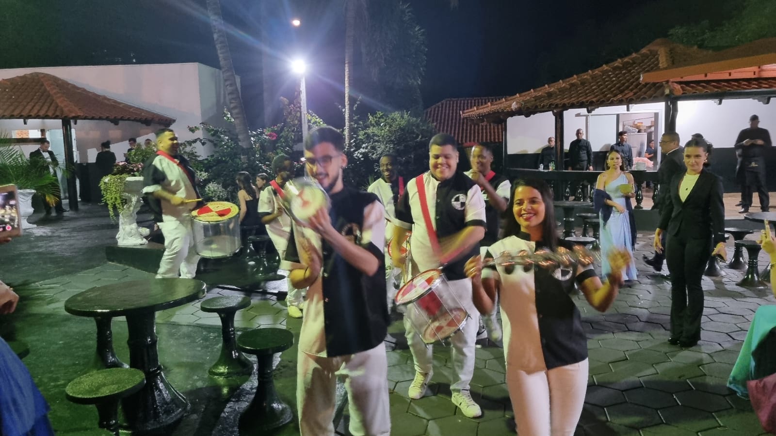 A aniversariante usou três trajes, um branco para receber os convidados, o lindíssimo vermelho da valsa, e um macacão preto bordado para acompanhar a escola de samba, por volta das três da madrugada.
