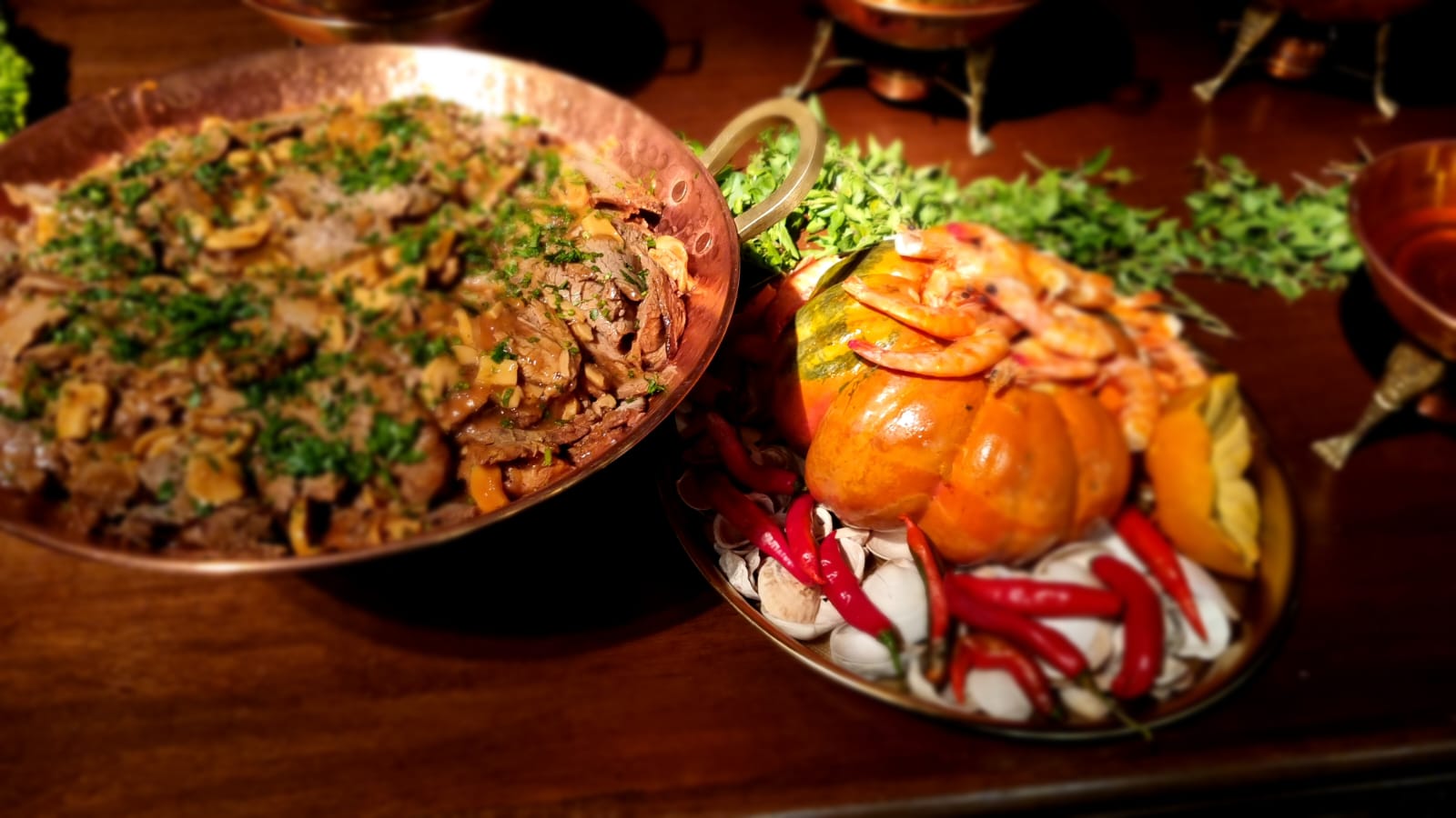 - Além da exuberante pista de entradas e petiscos, frutos do mar e filé ao molho madeira compunham o jantar.