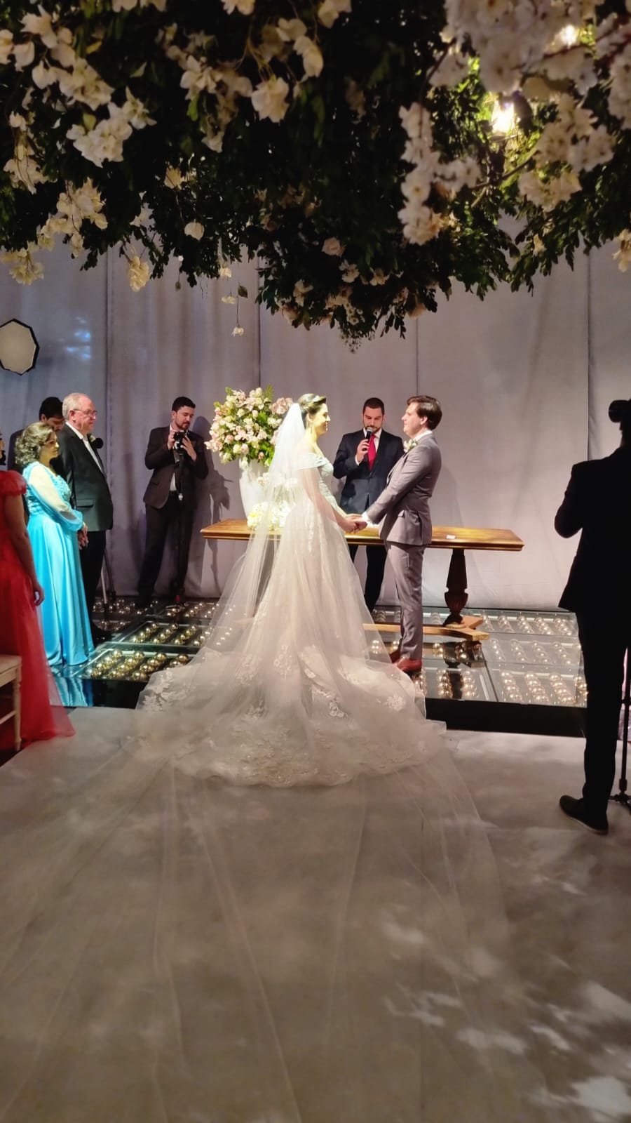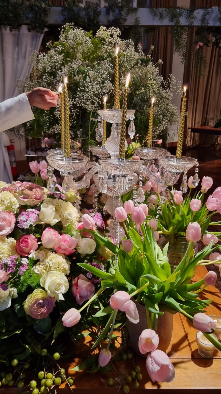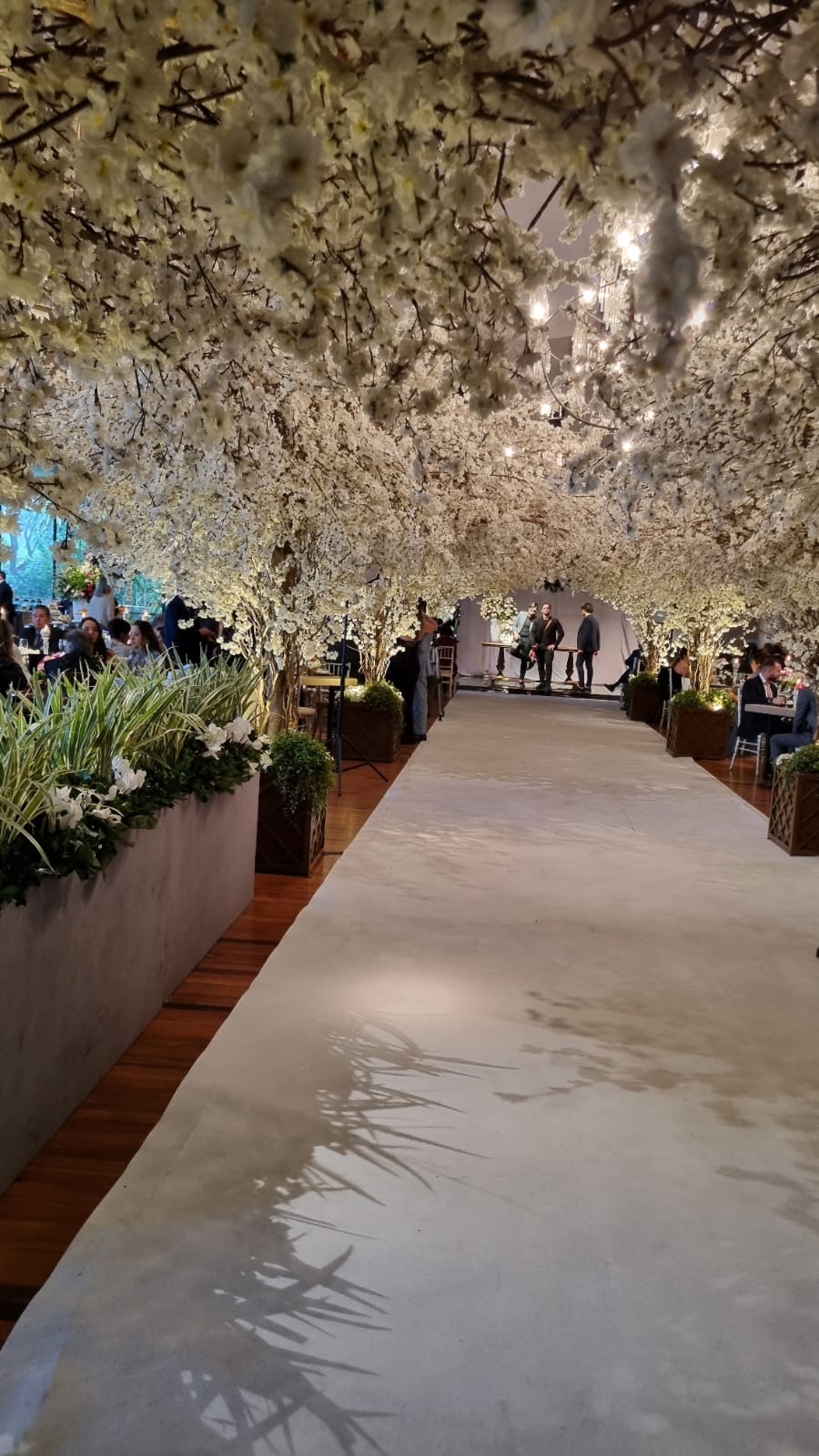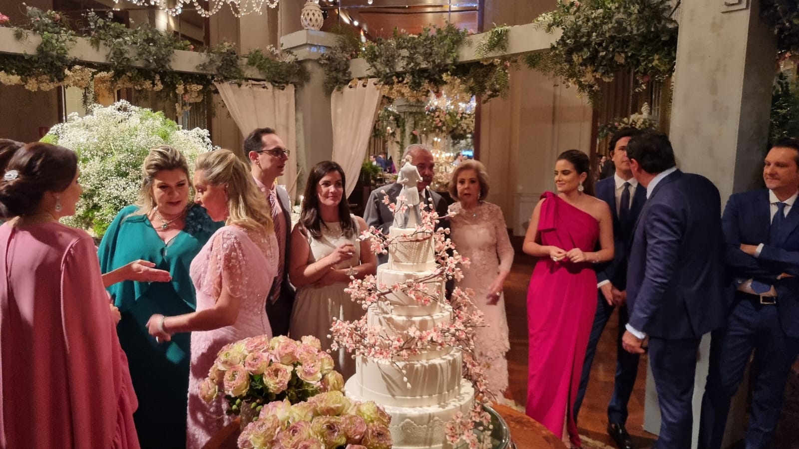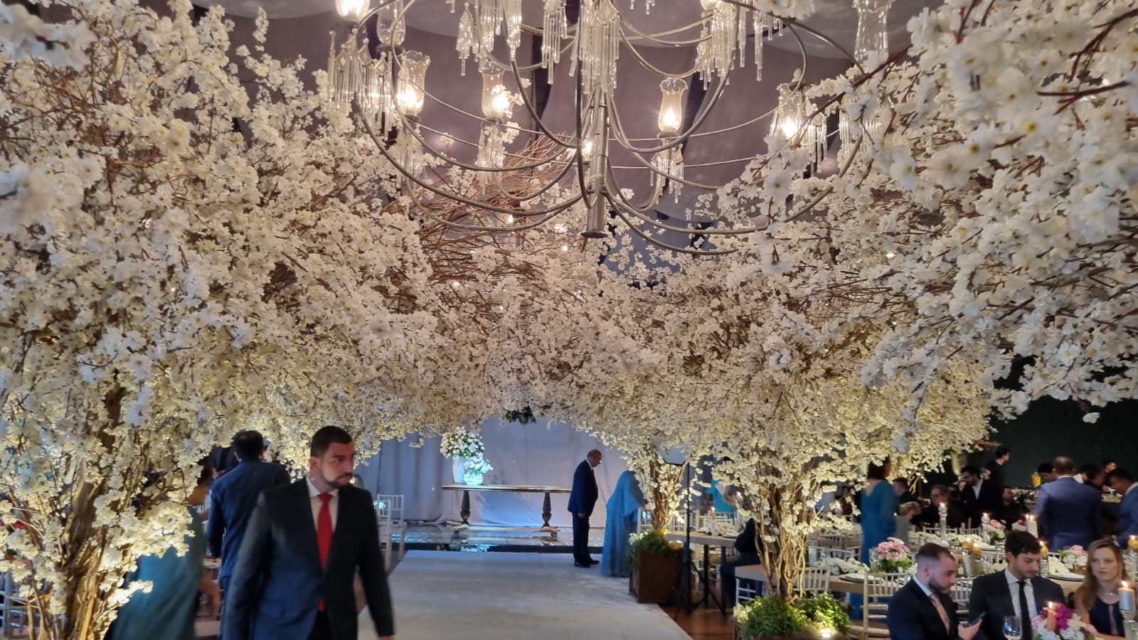 Lisianthus, rosas, orquídeas nas mesas e um corredor de flores de laranjeiras que deixou boquiabertos os convidados habituados com festas glamourosas.