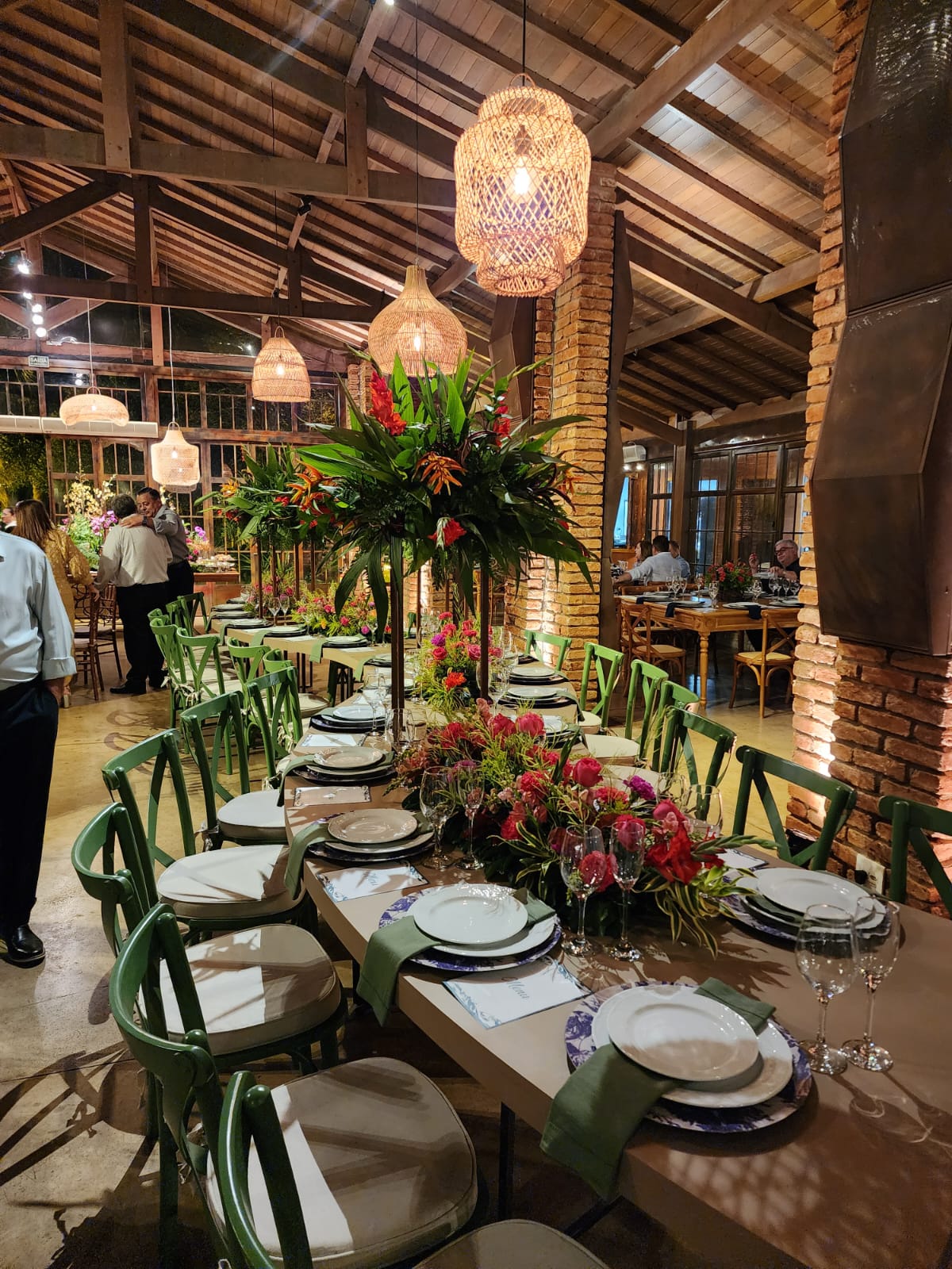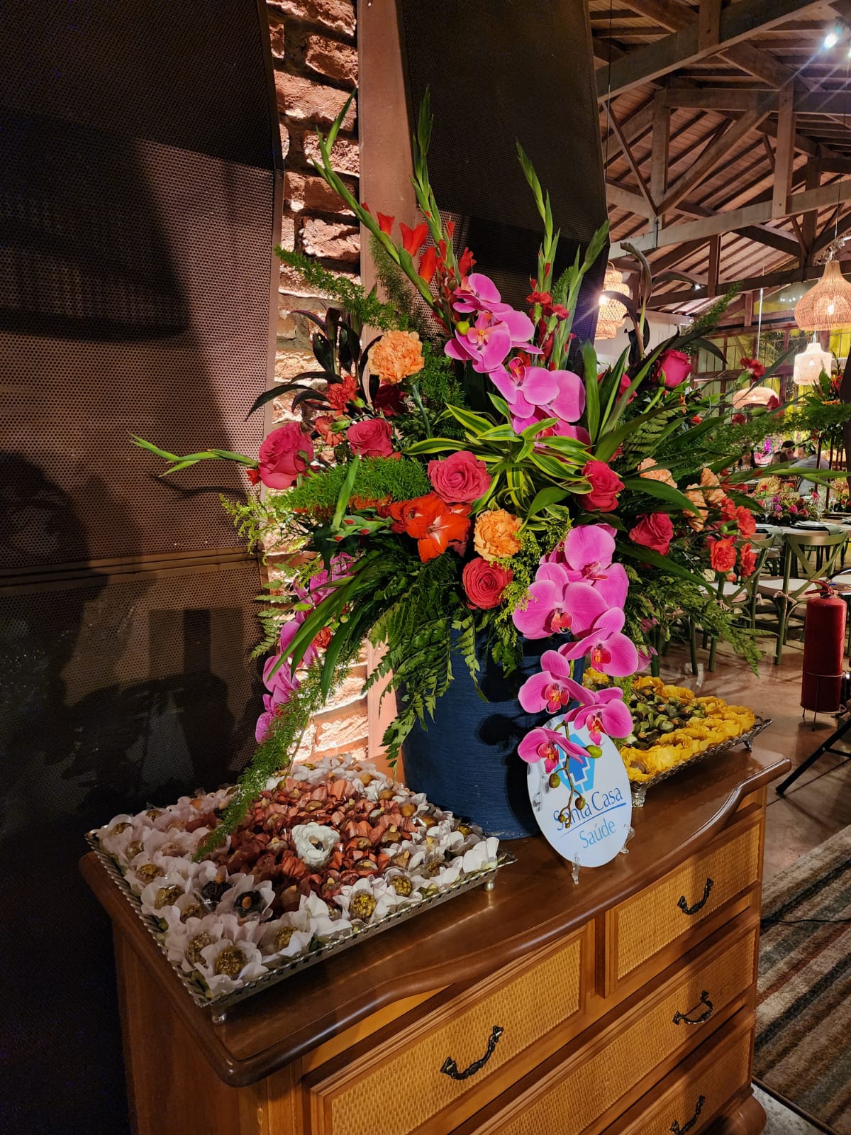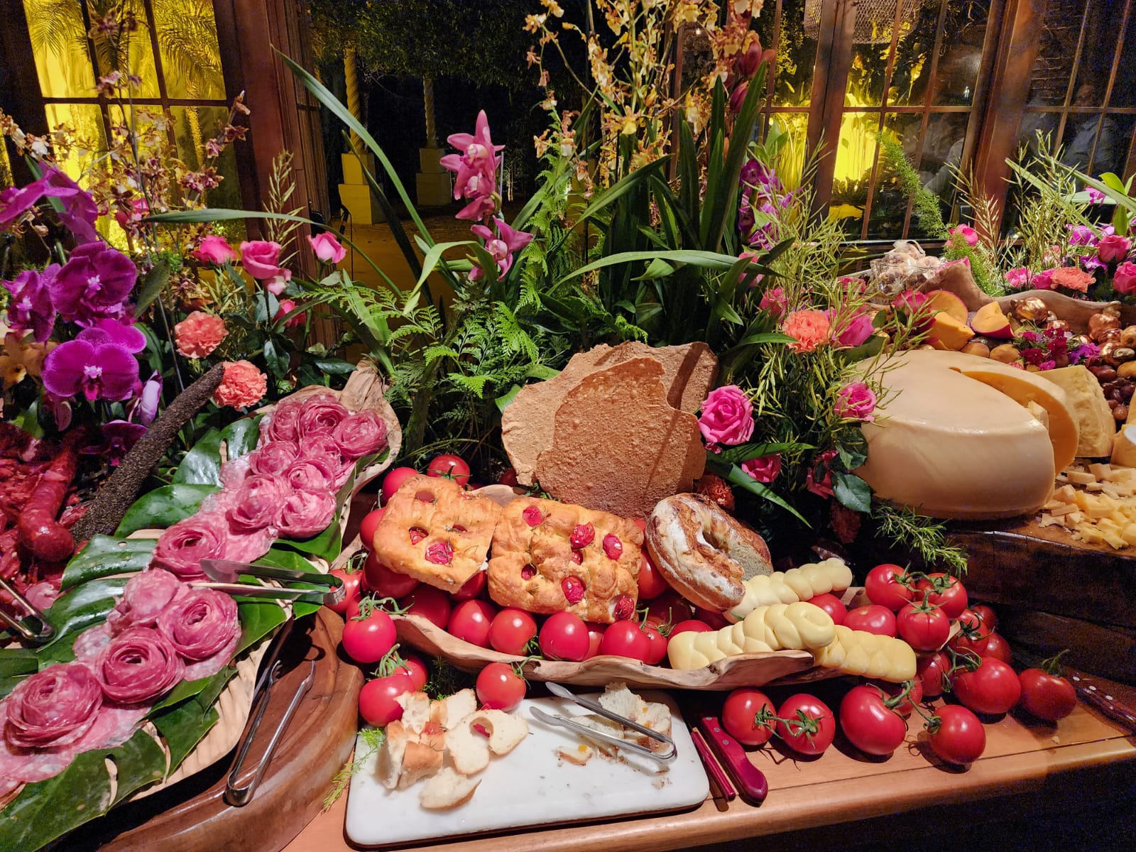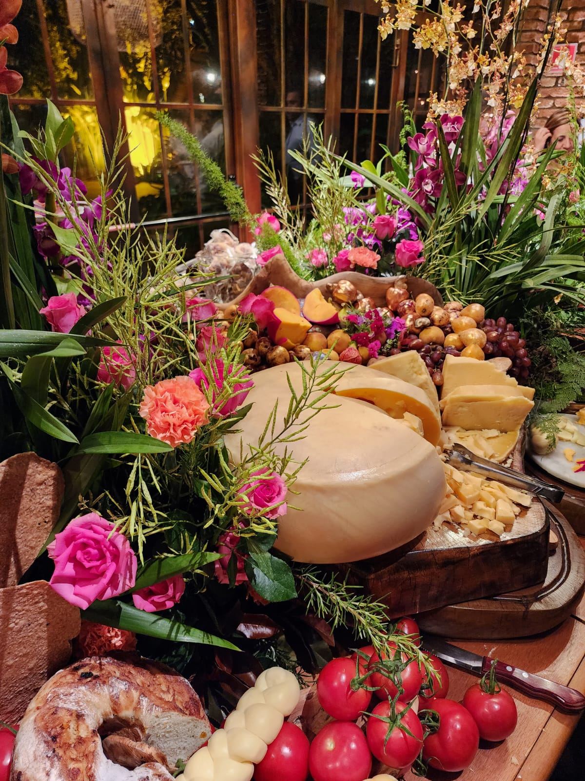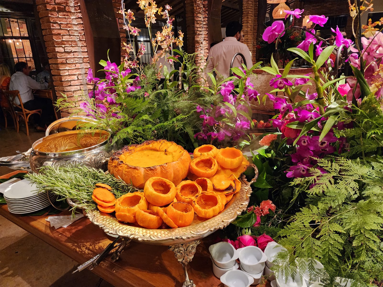 O deslumbre do aparador de comidas, com arranjos de orquídeas esbanjando cores. Na ilha de antepastos, os convidados se serviam de volantes quentes, frios, queijos finos. E degustavam do impecável cardápio, bacalhau, camarão, tornedos de filé mignon, cogumelos.