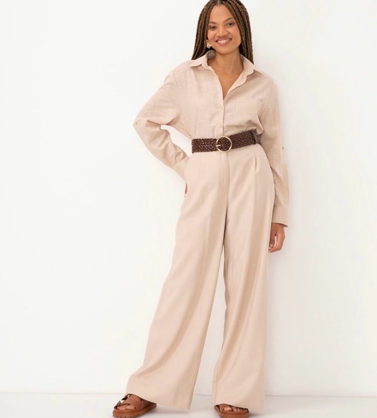 2. Tons Neutros com Toque Festivo: Experimente uma combinação de tons neutros como creme, bege ou nude. Um suéter de gola alta creme, combinado com uma saia plissada dourada ou prateada, pode criar um contraste encantador e adequado para a ocasião. Adicione acessórios discretos para manter a elegância.
