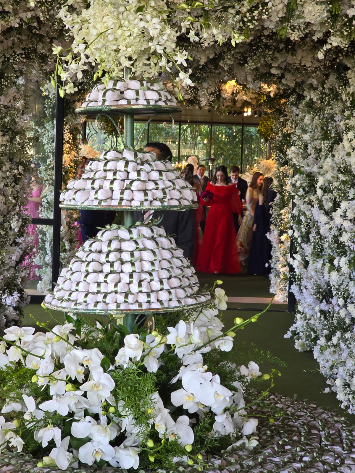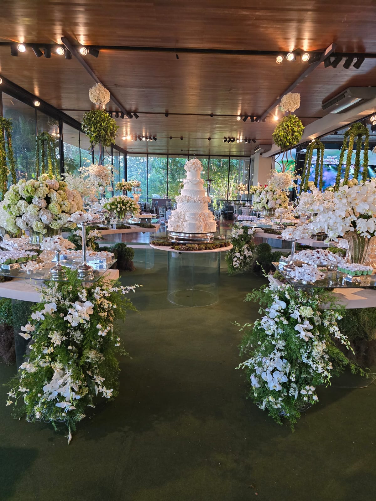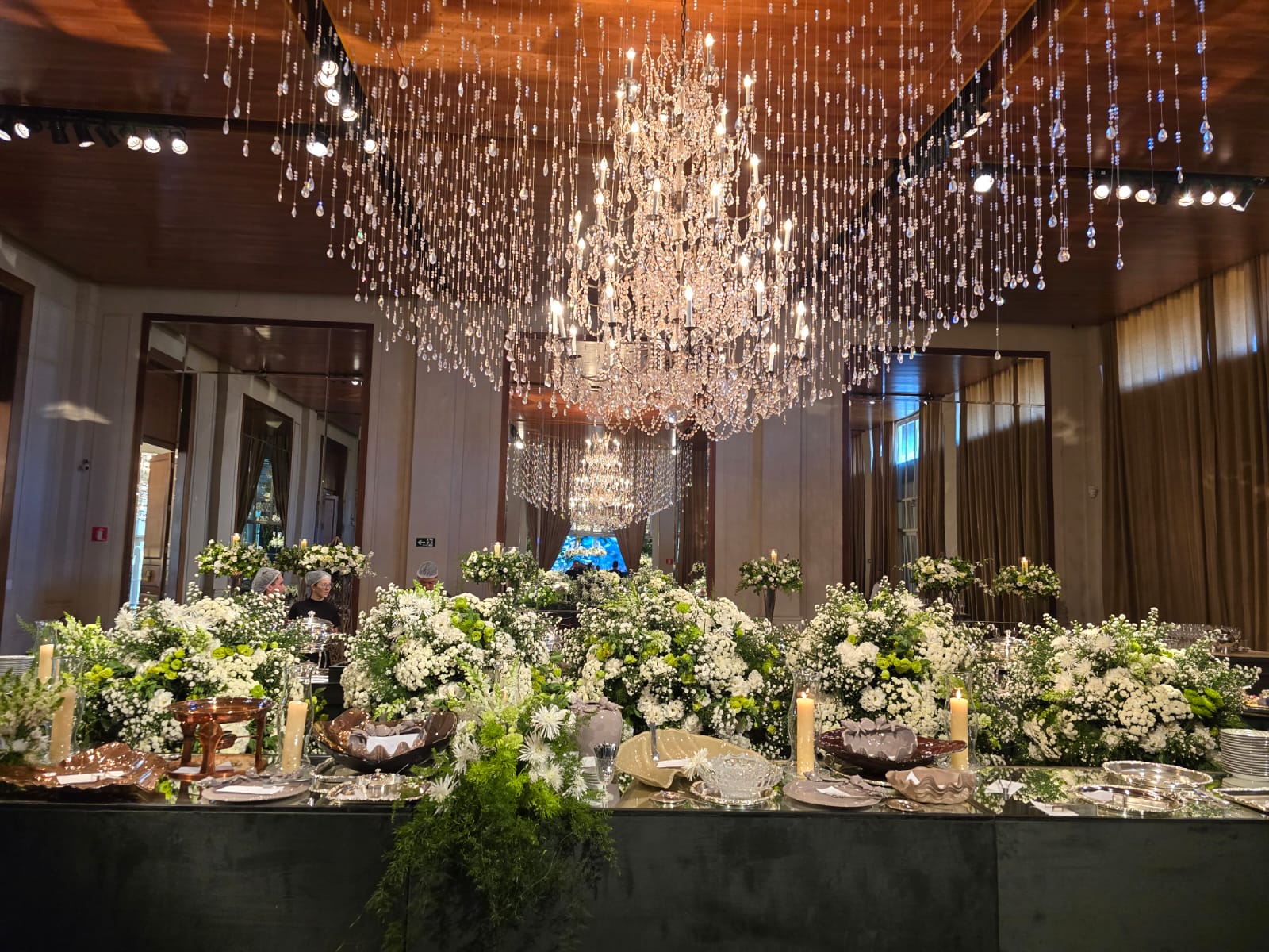 O branco predominou entre as milhares de flores, rosas, lisianthus, orquídeas, que caíam do teto em forma de castiçais, ou embrulhadas em ciprestes, formando túneis entre os inúmeros ambientes.