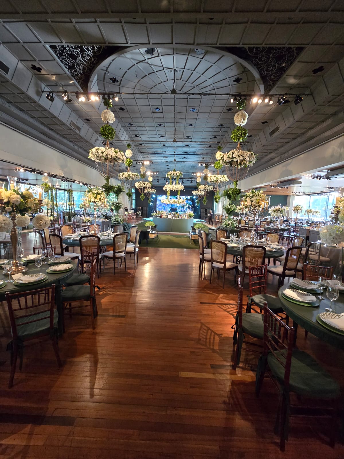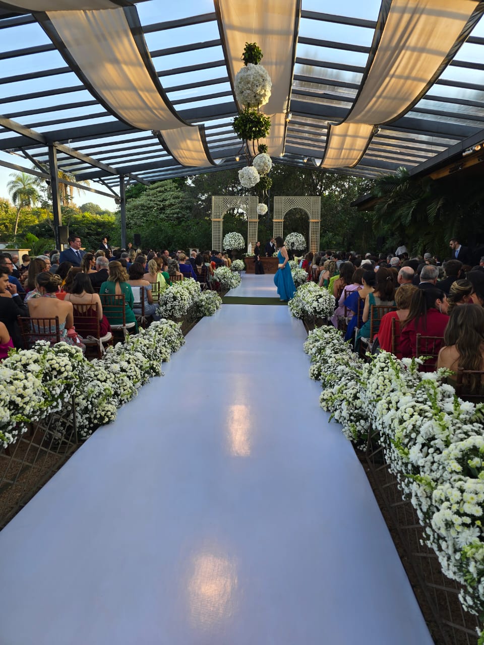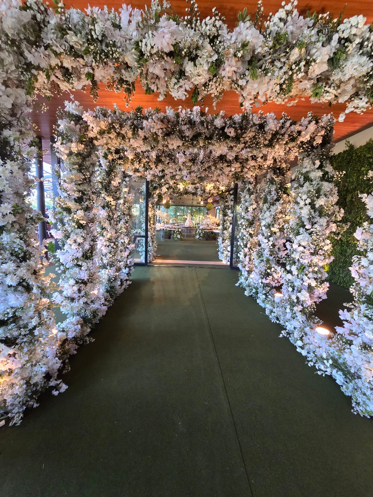 O branco predominou entre as milhares de flores, rosas, lisianthus, orquídeas, que caíam do teto em forma de castiçais, ou embrulhadas em ciprestes, formando túneis entre os inúmeros ambientes.
