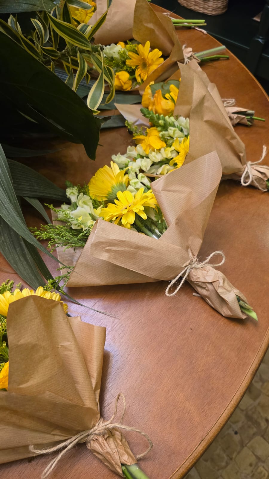 A noite foi finalizada com delicadeza: na despedida, cada convidado recebeu um miguet — um pequeno buquê de flores amarelas, embaladas em papel pardo e laçadas com sisal — um detalhe que traduzia com perfeição a elegância do casal.