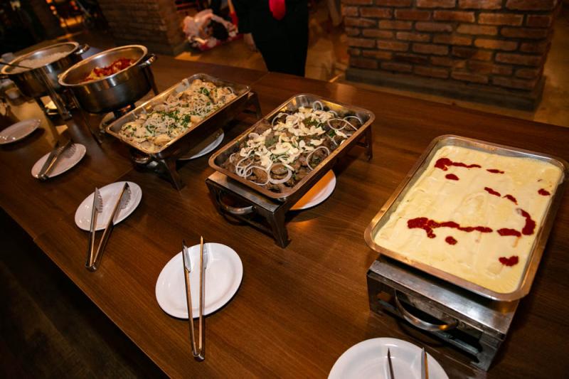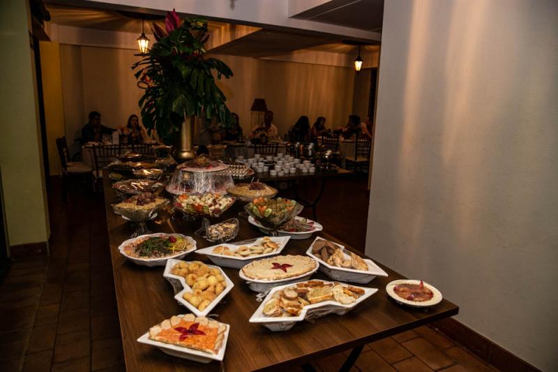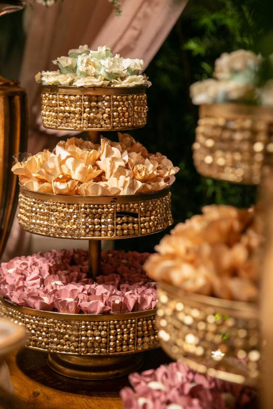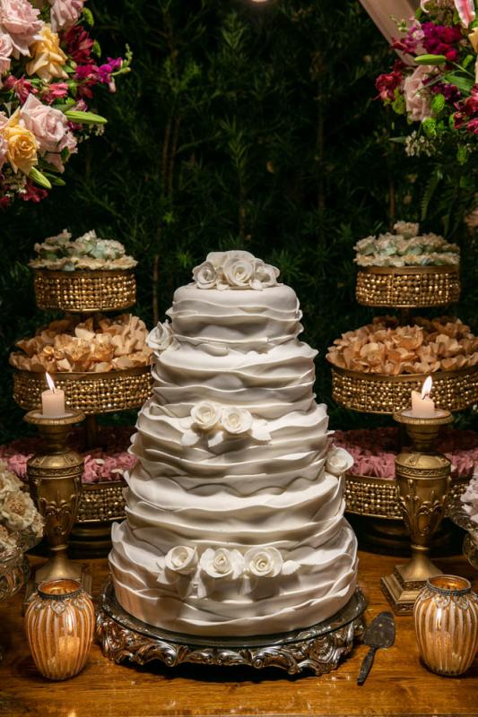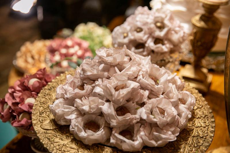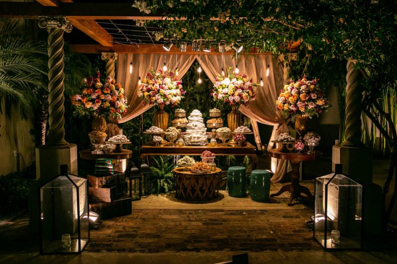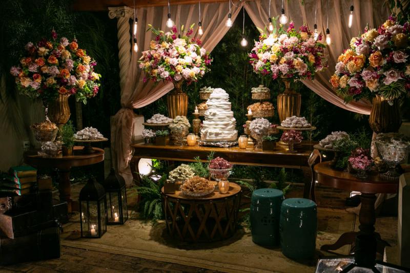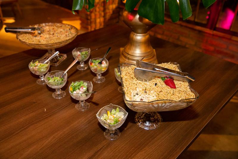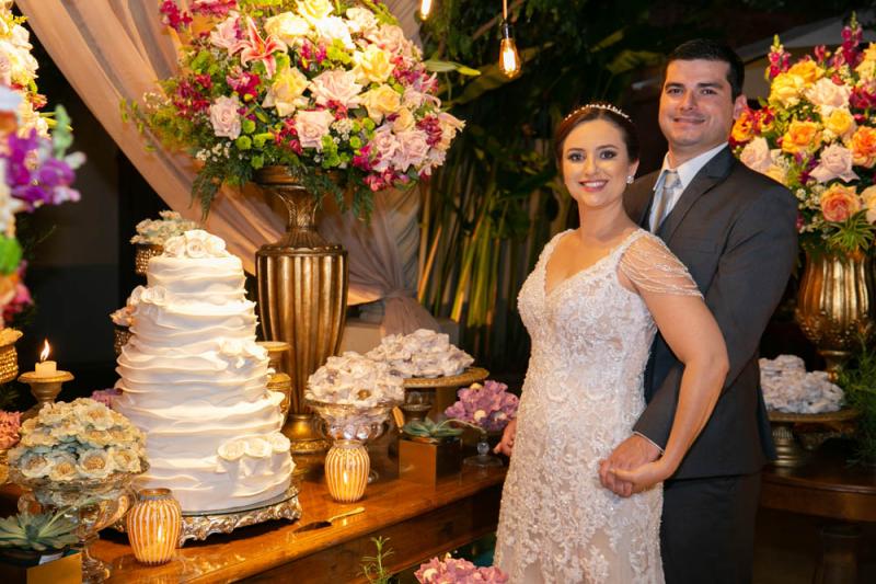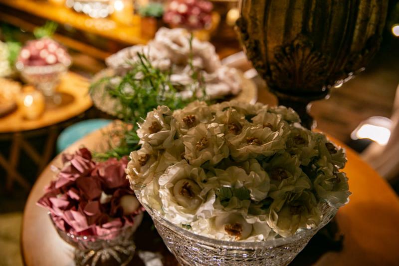 O buffet, assinado pela Bastianini Eventos, dispôs várias ilhas gourmets tendo como entrada finger foods e frios nobres, e um jantar elaborado especialmente com menu personalizado pelos noivos. A empresa escolhida para os doces finos foi a Somel Doceria, com seu sabor inigualável em variadas opções e o bolo cenográfico elaborado por Dori Alvarenga.
