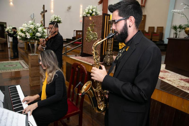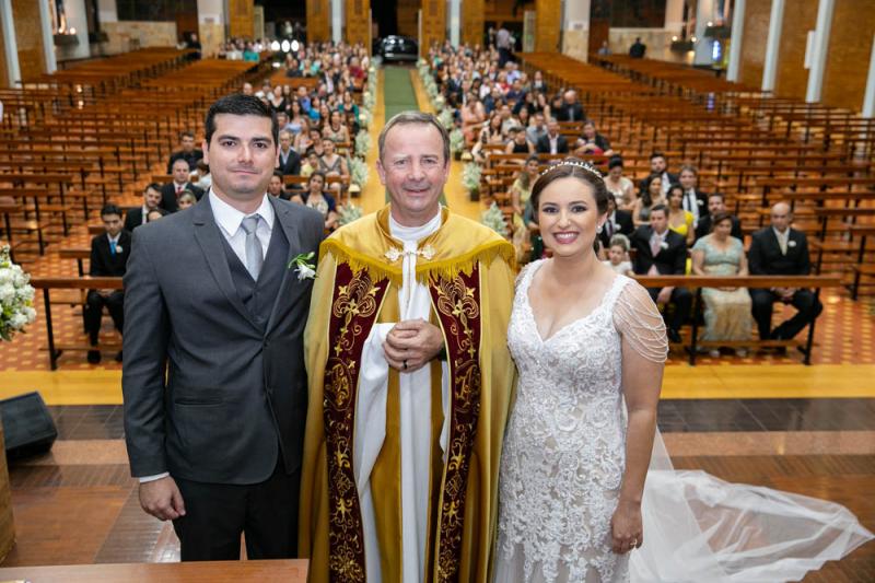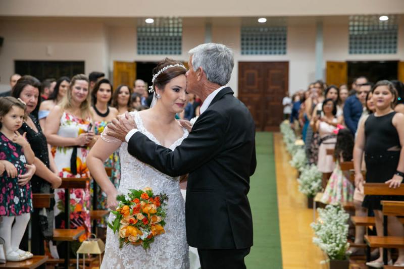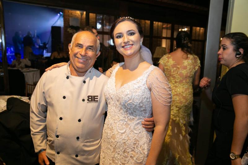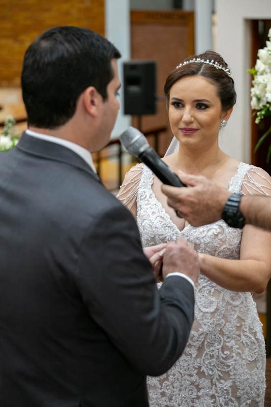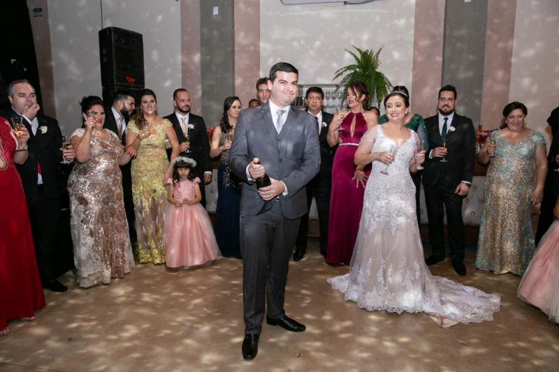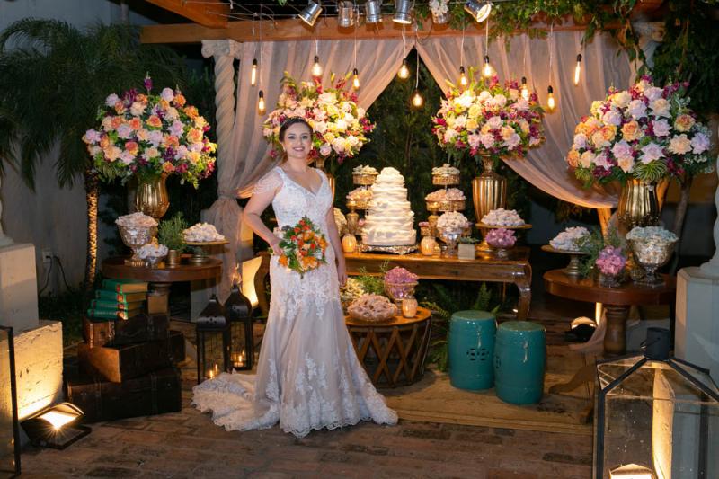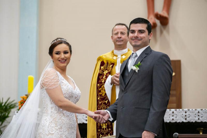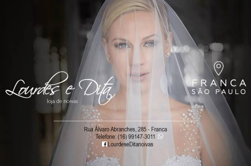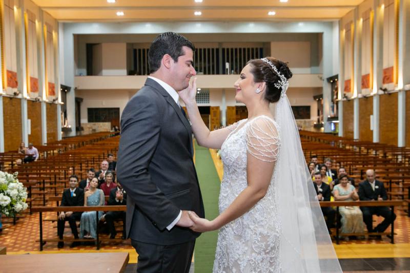 A beleza da noiva ficou a cargo dos experts Paulu's Cabeileireiros e J.A. Menegoti Maquiagens, de Guará e o vestido, semi-sereia, com forro nude, tule e renda rebordadas com pedras Swarovisk é da Lourdes e Dita Noivas.