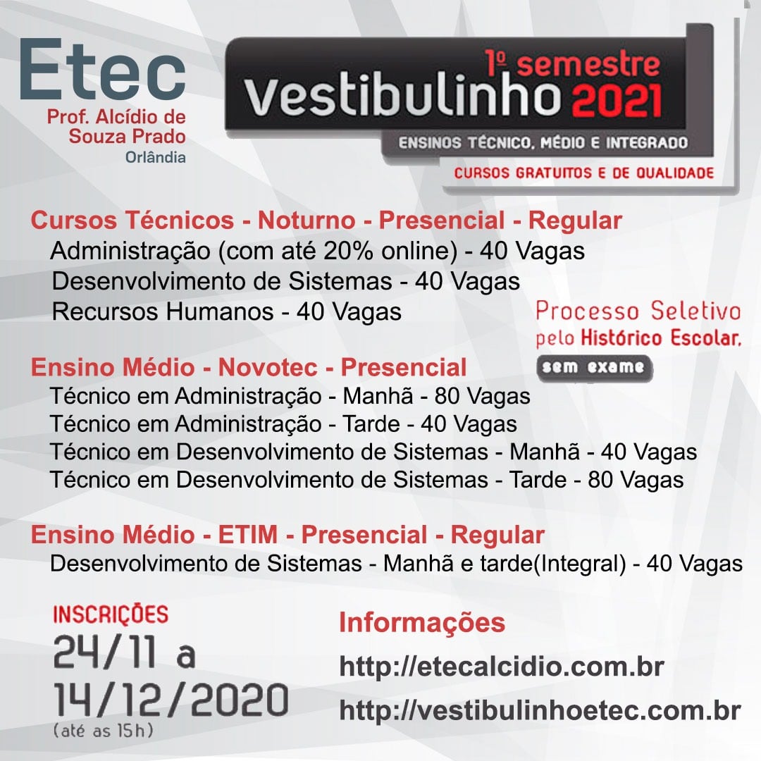 Em Orlândia, a ETEC Alcídio de Souza Prado está com vagas abertas para 3 cursos técnicos, além dos cursos do Ensino Médio.