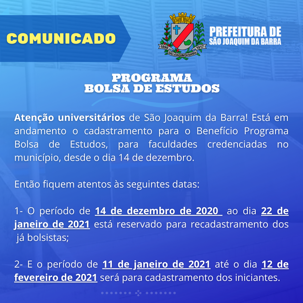 O programa começou no dia 14 de dezembro, com o recadastramento dos veteranos para atualizar a bolsa. Nessa categoria, o prazo vai até o dia 22 de janeiro.