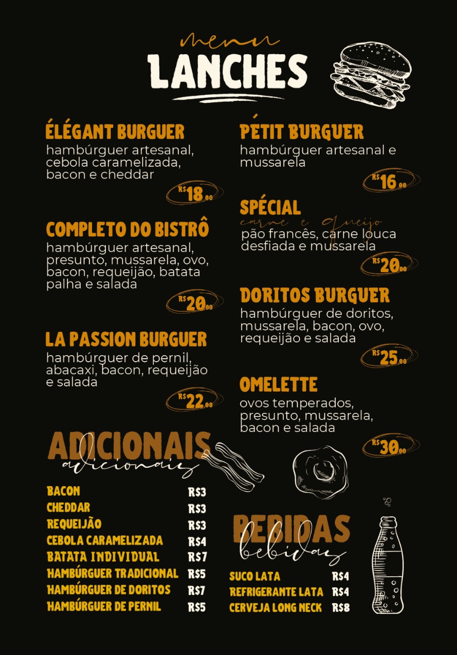 Um dos destaques é o La Passion Burguer, que vem com hamburguer de pernil, abacaxi, bacon, requeijão e salada. Outra inovação da casa é o Doritos Burguer, um lanche feito com hamburguer de Doritos.