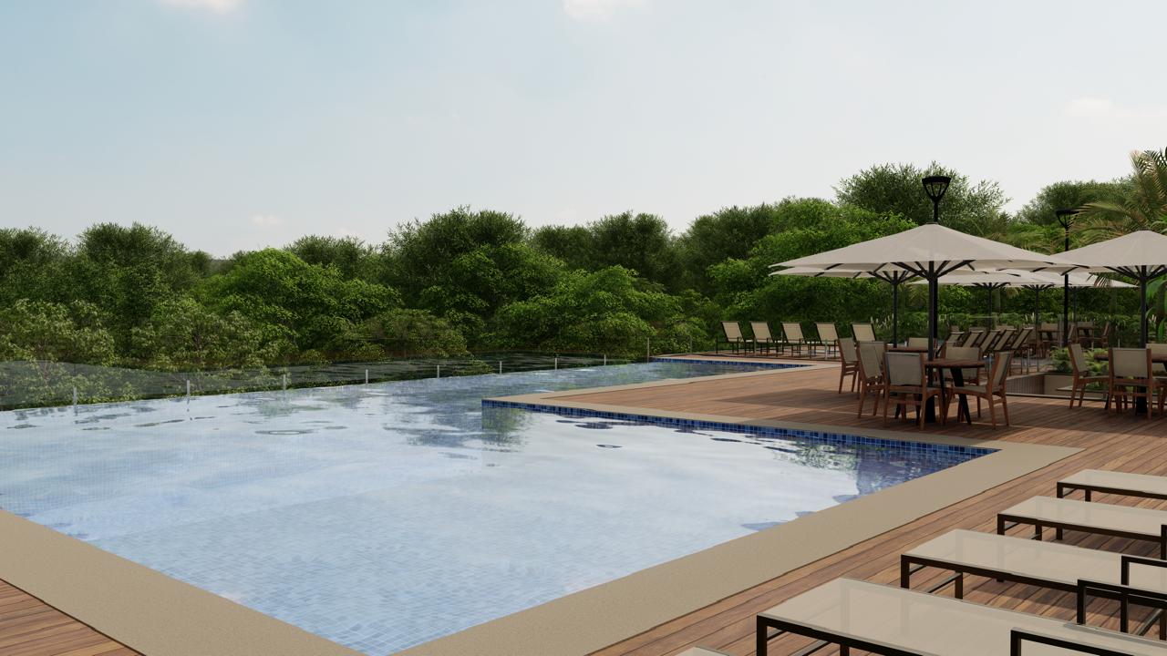 ● Piscina com borda infinita, deck molhado e piscina infantil
