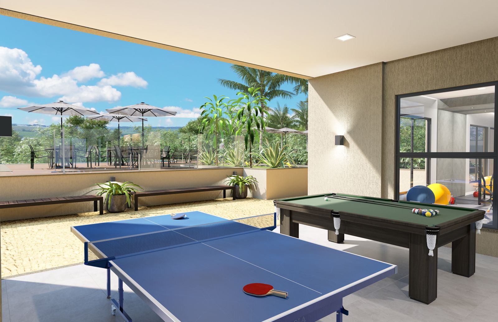 Com 135,30 m² de área privativa, os apartamentos têm três suítes, varanda gourmet e até três vagas de garagem . Mas o que realmente transforma o Maria Maria em uma escolha especial são os ambientes compartilhados: espaços funcionais, bem equipados e pensados para todas as idades.